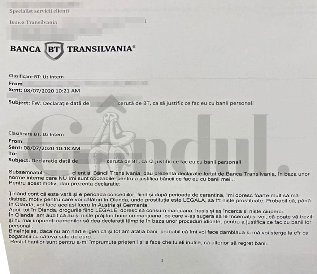 Bineînțeles, dacă nu am hârtie igienică și tot am atâția bani, probabil că îmi voi face damblaua și mă voi șterge la c***, ca bogătașii, cu câteva sute de euro. Restul banilor sunt pentru a-mi împrumuta prietenii și a face cheltuieli inutile, ca ulterior să regret banii”, a scris clientul nemulțumit în declarația care i-a fost solicitată de Banca Transilvania.