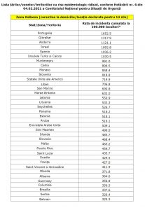Art.1 – Se aprobă lista țărilor/zonelor/teritoriilor cu risc epidemiologic ridicat pentru care se instituie măsura carantinei asupra persoanelor care sosesc în România din acestea, prevăzută în anexa nr. 1.
