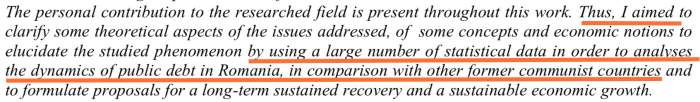 Concluziile (care ar fi trebuit potrivit autorilor să formuleze propuneri pentru o creștere economică sustenabilă) nu există din acest punct de vedere și sunt de-a dreptul, nu mă feresc să o spun, imbecile, măcar și pentru că sunt scrise idiot în limba engleză (foto dreapta): ,,the conditions of the Romania’s accession to the Monetary Union targets too also other….” Ce naiba vrea să spună autorul? Și unde sunt propunerile? Cum s-a împrumutat România? Cum ar fi trebuit să se împrumute România? A făcut sau nu refinanțări ale datoriei publice? Cum sunt scadențele datoriei publice, cum au evoluat, cum au evoluat pe ce tip de scadențe și pe ce monede componentele datoriei publice? NIMIC. Nada. Zero. Niente.