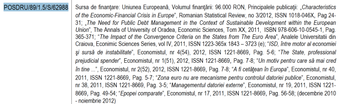 - Articol 1: (și singurul de unic autor dintre cele 3 invocate) ,,The Impact of the Convergence Criteria on the States from The Euro Area” publicat în 2011 în Revista Analele Universității din Craiova (non-ISI și cea mai slabă categorie de cotare pentru o revistă – Categoria C), vol IV.;