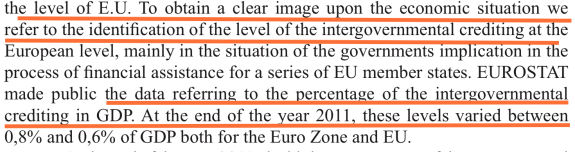 Observați așadar că nu este nicio centralizare propie pe baza datelor Băncii Centrale Europene ci pur și simplu date și calcule copiate. Observați că Marcu și Meghișan nu cunosc faptul că în limba engleză (și în cercetarea economică) împrumuturile sunt ,,loans” și nu ,,credits”, că a 3-a coloană rândul 2 nu indică faptul că datele și calculele se referă la diferența în puncte procentuale raportate la PIB în trimestrul 3 2011 compartiv cu celelalte, și, desigur, tăierea ultimei coloane din tabel pentru că Marcu și Meghișan au găsit gred de descifrat păsăreasca Eurostatului – IGL, și prin urmare, deși acesta era un element de strictă noutate publicat de Eurostat și care îi interesează pe analiști și cercetători, au decis să zboare coloana.