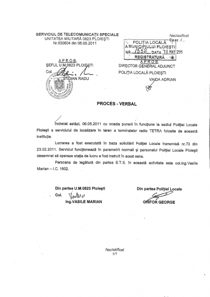 Astfel, devine dubioasa actiunea in aparare a inculpatilor in procesul de la Judecatoria Ploiesti cu un Proces-Verbal incheiat intre STS si Politia Locala Ploiesti la data de 06.05.2011 si inregistrat la Politia Locala Ploiesti sub nr 1552/10.05.2011, avand in vedere ca achizitia a fost efectuata prin factura nr 61/11.08.2010 in baza unui Caiet de Sarcini ce nu a fost respectat, ce prevedea achizitia unor elemente ce nu au ajuns in cadrul institutiei dar si termene precise de maxim 60 de zile.