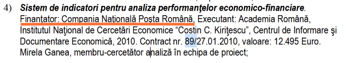 Așa cum se observă din obiectul contractului, tema de cercetare a fost analiza dinamicii și structurii activelor Poștei Române, analiza dinamicii și structurii capitalurilor, analiza corelației dintre structuri și capitaluri, analiza veniturilor realizate și analiza rentabilității activității, adică o simplă folosire, în dinamică, a indicatorilor pe care deja Poșta Română îi avea, și mai mult, trebuiau deja analizați de propriul deparament de ,,bugete și analize economice”.