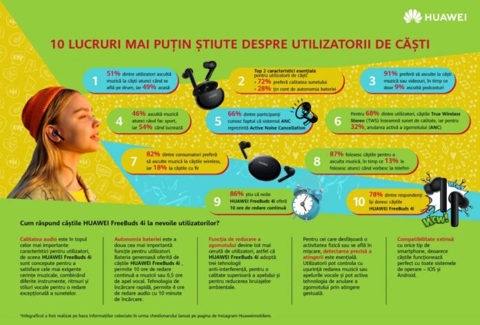 În cazul celor mai importante caracteristici pentru utilizatorii de dispozitive audio care au răspuns întrebărilor, 72% au menționat calitatea sunetului, în timp ce 28% au ales autonomia bateriei. Participanții sunt, totodată, foarte bine informați în ceea ce privește funcționalitățile căștilor în general, astfel că 66% dintre aceștia cunosc faptul că ANC reprezintă funcția Active Noise Cancellation, iar 68% știu că True Wireless Stereo (TWS) înseamnă sunet de calitate prin asocierea bluetooth. În plus, 86% dintre respondenți sunt la curent cu faptul că noile HUAWEI FreeBuds 4i oferă 10 ore de redare continuă.