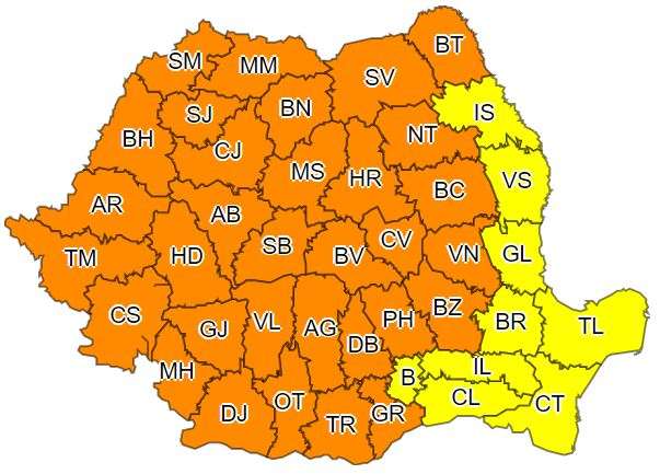 Administraţia Naţională de Meteorologie a emis Cod portocaliu de precipitaţii, vijelie puternică şi grindină pentru 32 de judeţe, precum şi o atenţionare Cod galben de instabilitate atmosferică temporar accentuată pentru toată ţara, valabilă de vineri, ora 12:00, până sâmbătă, ora 23:00.