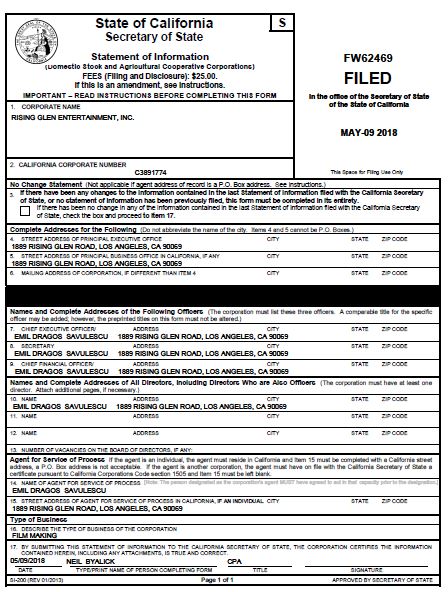 Datele oficiale ale Secretariatului de Stat al Californiei arată că omul de afaceri, Dragoş Emil Săvulescu, condamnat definitiv în România la 5 ani şi 6 luni de închisoare cu executare în dosarul Retrocedărilor şi, ca pedeapsă complementară după executarea pedepsei, 3 ani interzicerea unor drepturi, este înregistrat de 4 ani ca agent pe teritoriul american, în Los Angeles, California, în numele firmelor pe care le-a înfiinţat în 2015 şi 2016 şi pe care le controlează – Amber Alert Entertainment Inc şi Rising Glen Entertainment Inc.