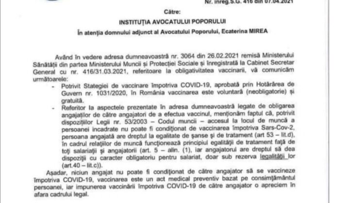 Ministerul Muncii a confirmat/Vaccinarea nu poate fi obligatorie/Impunerea vaccinării împotriva COVID-19 de către angajator nu este într un cadru legal – Ziarul Incisiv de Prahova