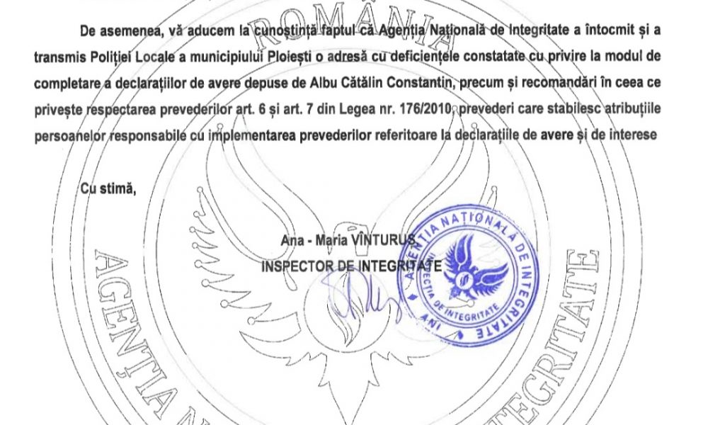 „referitor la numirea lui Albu Catalin Constantin in functia publica de conducere de director general al Politiei Locale Ploiesti , acesta NU a depus declaratia de avere si declaratia de interese in termenul prevazut de art 6 alin 1 din Legea susmentionata, motiv pentru care A.N.I va proceda la sanxtionarea contraventionala a domnului Albu Catalin Constantin, in conformitate c u dispozitiile art 29(1) din Legea nr 176/2010. ”