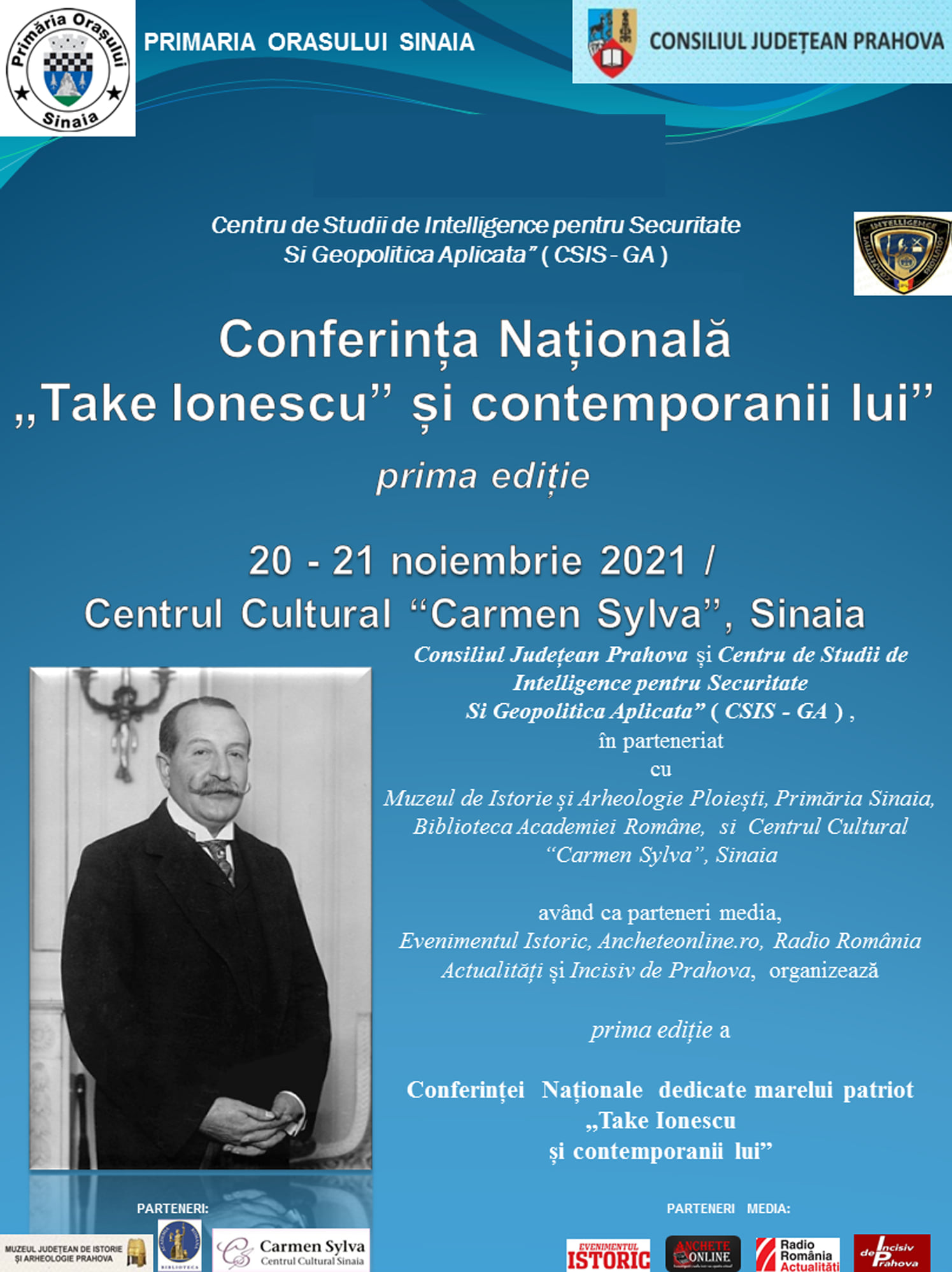 Conferința Națională ”Take Ionescu și contemporanii lui” se va desfășura la Sinaia, la Centrul Cultural ”Carmen Sylva”, în perioada 20-21 noiembrie. Evenimentul, organizat de Centrul pentru Studii de Intelligence și Geopolitică Aplicată, sub egida Consiliului Județean Prahova și Primăria Sinaia, va avea loc chiar în lăcașul întemeiat de Regina Elisebeta a României, care purta pseudonimul literar, Carmen Sylva.