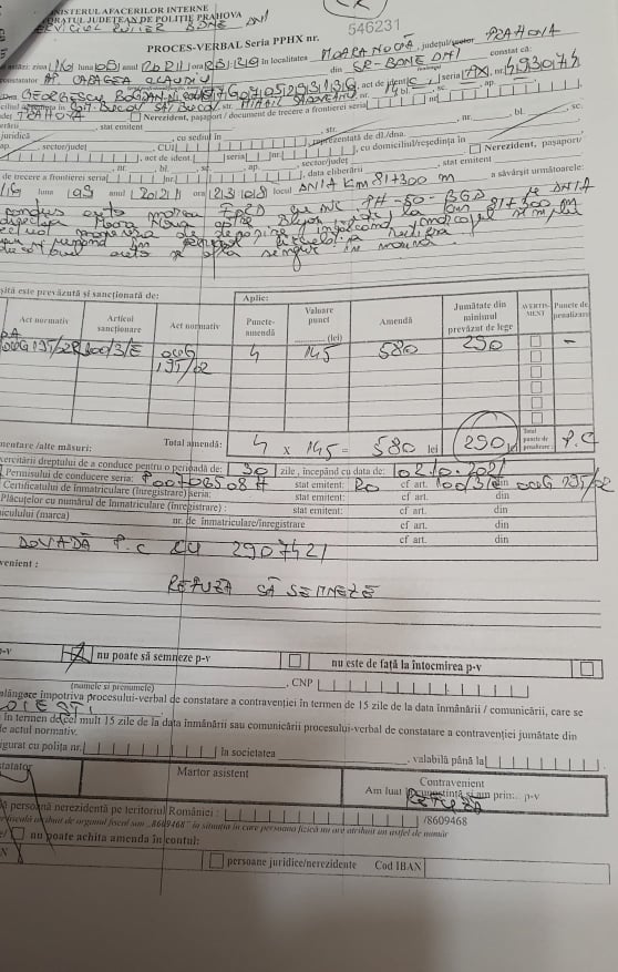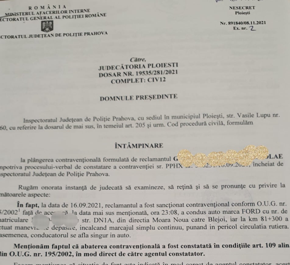 Mentionam ca, pana la data depunerii plangeri contraventionale NU a primit procesul verbal de contraventie PPHX nr. 546231 din data de 16.09.2021, motiv pentru care a rugat Onorata Instanta sa aprobe si sa il solicite, oficial, de la I.P.J. Prahova.