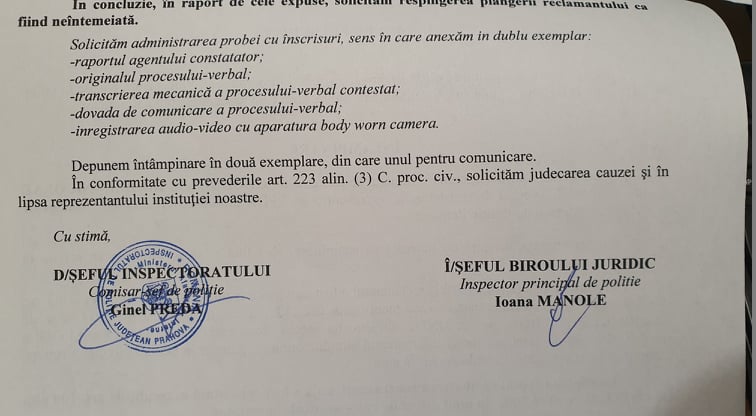 Ii atragem doar atentia, deocamdata, ca prin adresele de intampinare catre instante, in care petentii reclama abuzuri ale celor de la Serviciul Rutiera, prin semnatura sa – gireaza aceste abuzuri in adresele inaintate catre aceasta institutie, fara probe concludente si reale.