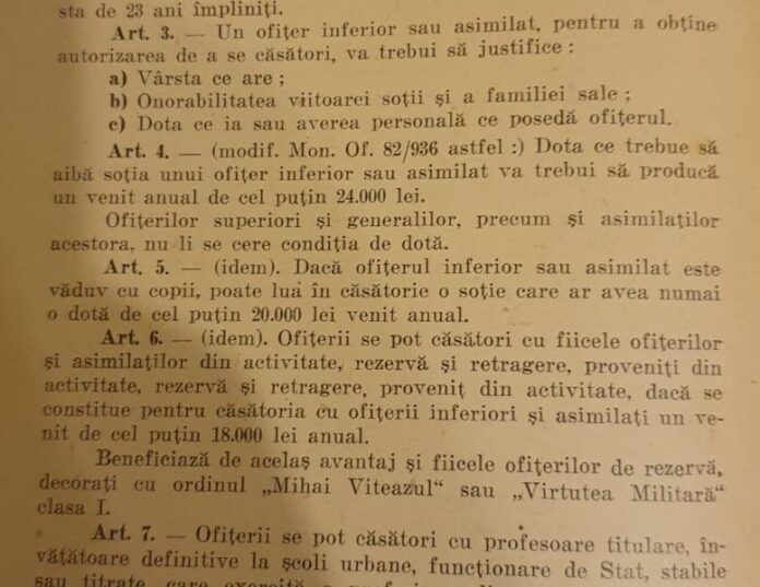 Domnule ofiţer – sau subofiţer, după caz – ai 23 de ani împliniţi? Da. Atunci, conform legii, te poţi însura. De la acest prim punct începeau procedurile. Armata aştepta de la viitoarea doamnă documente legate de zestre. De pildă, femeia să aibă un capital, un fel de depozit bancar, cum i se spune azi, din care să fie asigurată o dobândă anuală. Ei bine, această dobândă trebuia să fie de 2.500 de lei, în cazul în care domnişoara se mărita cu un locotenent. Dacă domnul era căpitan, venitul anual se putea reduce la 1.500 de lei. După probabilul principiu – soldă mai mare, zestre mai mică. Nu numai banii puteau constitui dota. Poate că domnişoara avea de la familia ei titluri de stat – aducătoare de venituri în sumele deja prezentate. Sau proprietăţi – imobile, terenuri – la fel de profitabile. Toate fiind certificate în prealabil la tribunal. Actele doveditoare erau prezentate comandantului Corpului de Armată, cel care emitea autorizaţia de căsătorie pentru subalternul său.