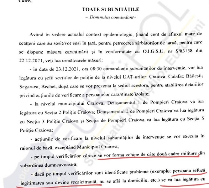 În situația în care vreunul dintre șefi dispune ca polițiștii din subordine să verifice persoanele carantinate, putem vorbi în mod clar despre o dispoziție dată cu nerespectarea prevederilor legale, cum ar fi: art. 1 din OMAI nr. 577/2008, art. 33 alin. (2) din OMAI nr. 105/2013, și art. 38 alin. (1) din Acordul Colectiv, având în vedere că polițiștii nu au astfel de atribuții în fișa postului.
