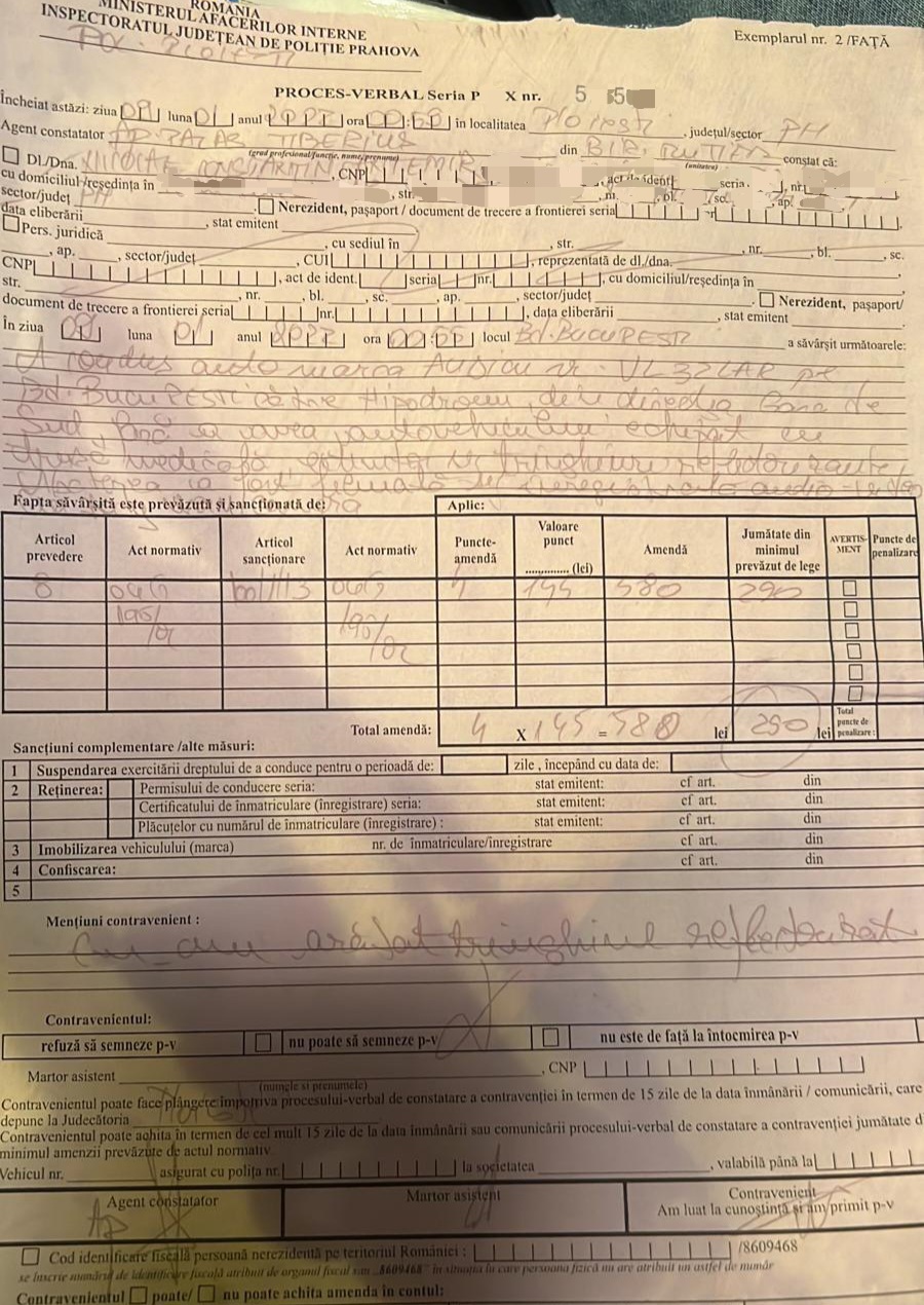 Din cate se poate observa pe procesul – verbal de contraventie, tanara „potcovita” stiind ca este hartuita si este un abuz grosloan (recunoscut si de „cocosel”) a mentionat in procesul verbal, un fel de haz de necaz „Nu am.Abia mi-am pus silicoane” si a refuzat sa semneze. Deci, tanara potcovita nu are procesul-verbal de contraventie (aceasta plecand in Germania) dar presupusa sa „rivala” il are de la „cocoselul” interlop si infractor Palas Cristinel Tiberius Marius de la Serviciului Rutier al I.J.P.Prahova (Biroul Rutier Ploieşti).