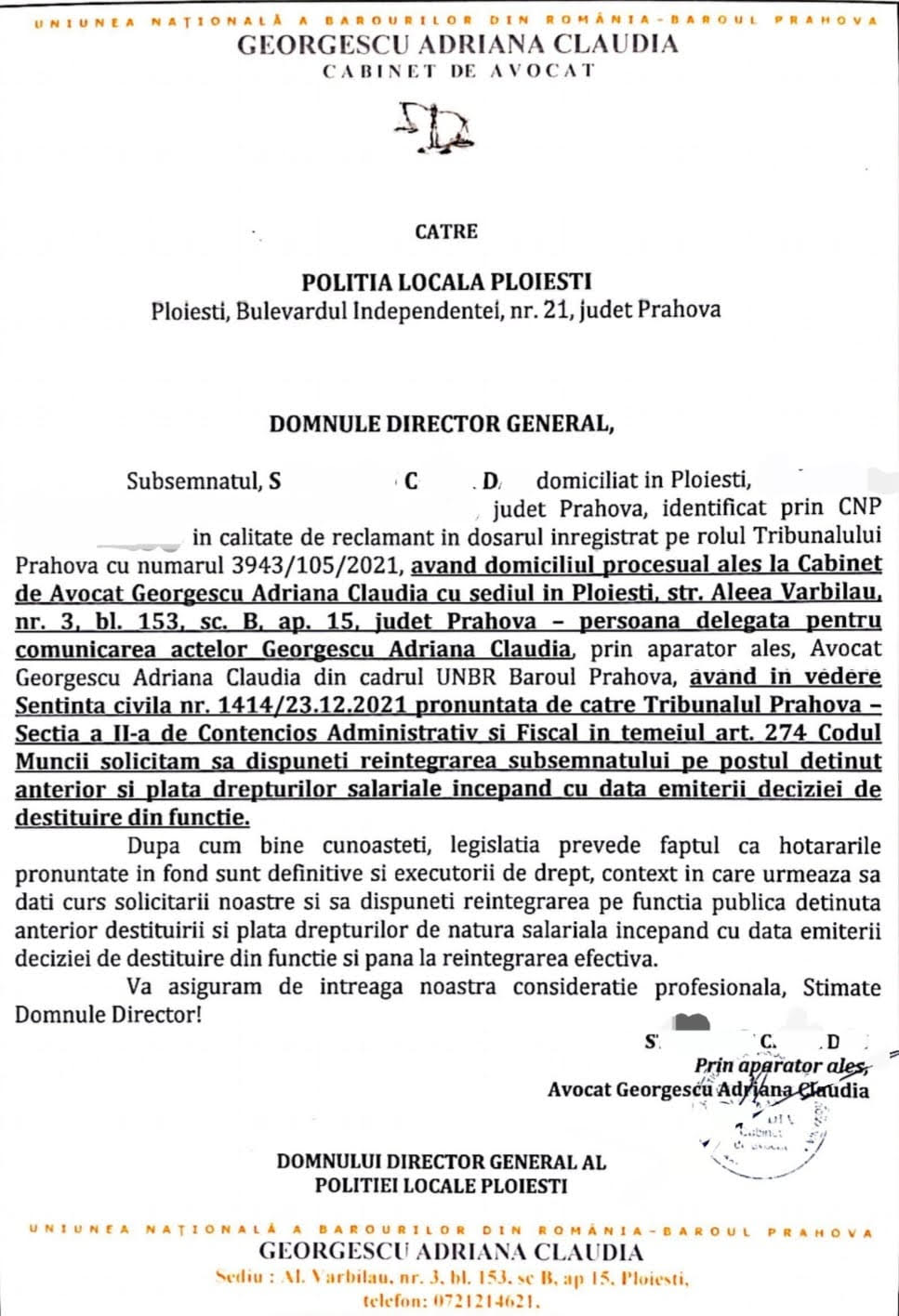 Azi, S.C.D a transmis Politiei Locale Ploiesti adresa de reaincadrare conform hotararii instantei care este executorie.