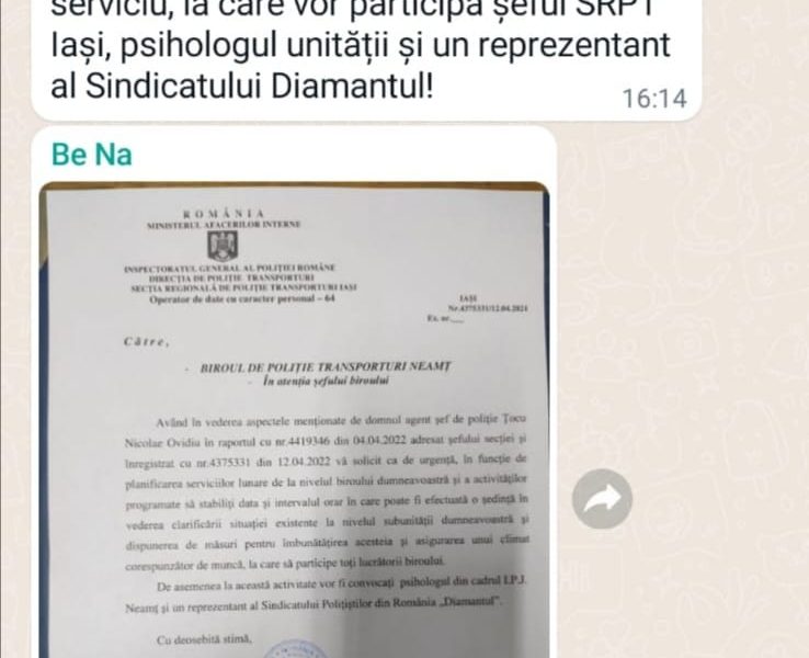 Răspunsul l-am primit ieri și sună ca o dezmințire precipitată, că nici usturoi n-au mâncat, nici gura nu le miroase (deci totul e în capul acelui șăfuleț). Va fi o mutare dar organizată de Serviciul Logistic de la IPJ Neamț, fără a antrena polițiștii. Mai mult, vajnicul șăfuleț primește o notificare că în data de 21.04.2022 va trebui să organizeze o ședință cu subalternii și șefii de la Secție, cu invitarea unui reprezentant sindical și a psihologului. SPR Diamantul va merge, că nu ne lăsăm membrii în bătaia vântului!