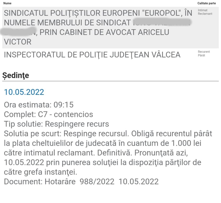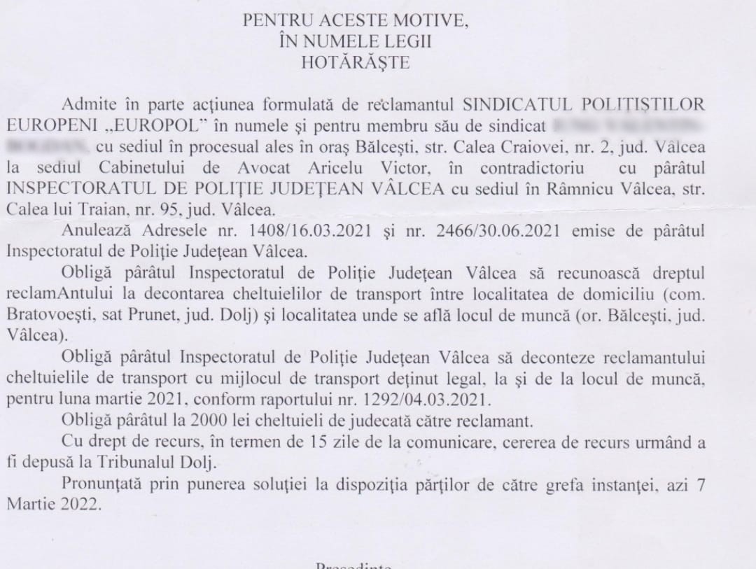 Astfel, prin Decizia Curţii de Apel Craiova a fost cofirmată soluţia pronunţată pe fond de Tribunalul Dolj, motivarea instanţei desfiinţând efectiv Ordinul MAI nr.136/2004, iar IPJ Vâlcea a fost obligată să îi deconteze membrului nostru de sindicat cheltuielile de transport de la noul domiciliu la locul de muncă. Având în vedere această decizie a instanței, vom solicita abrogarea în totalitate a acestui ordin de ministru vechi de aproape 20 de ani care nu face decât să limiteze drepturile polițiștilor.