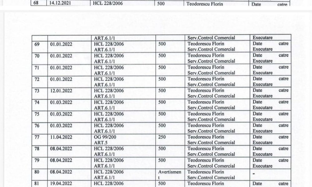 Alaturat va atasam lista cu contraventiile ilegale si abuzive emise in perioada 01.09.2021 – prezent, abuzuri si ilegalitati comise de sefi de birouri si/sau serviciu ca urmare al abuzului si incompetentei analfabetului functional Albu Catalin. Vom reveni pe acest subiect dupa depunerea sesizarii penale. (Cristina T.).