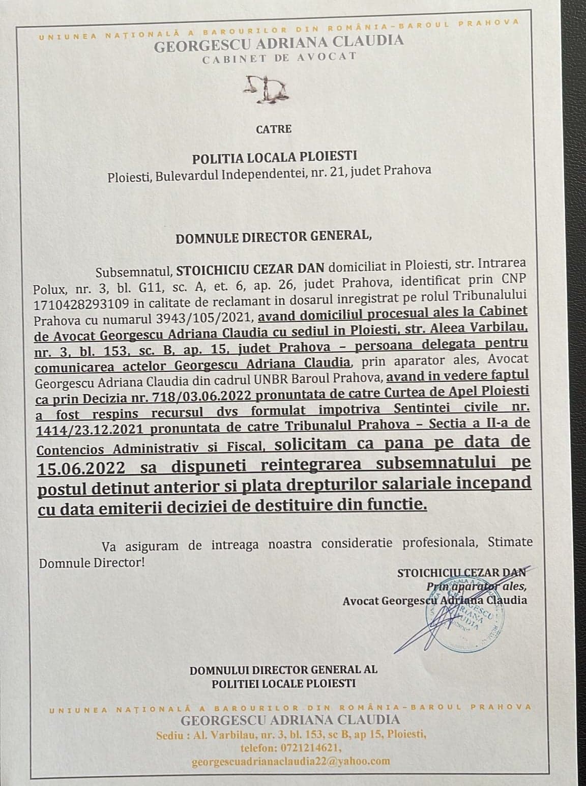 „Reprezentanții Poliției Locale Ploiești au precizat pentru ziarul…………că vor duce la îndeplinire hotărârea instanței și-l vor reîncadra pe funcție”.