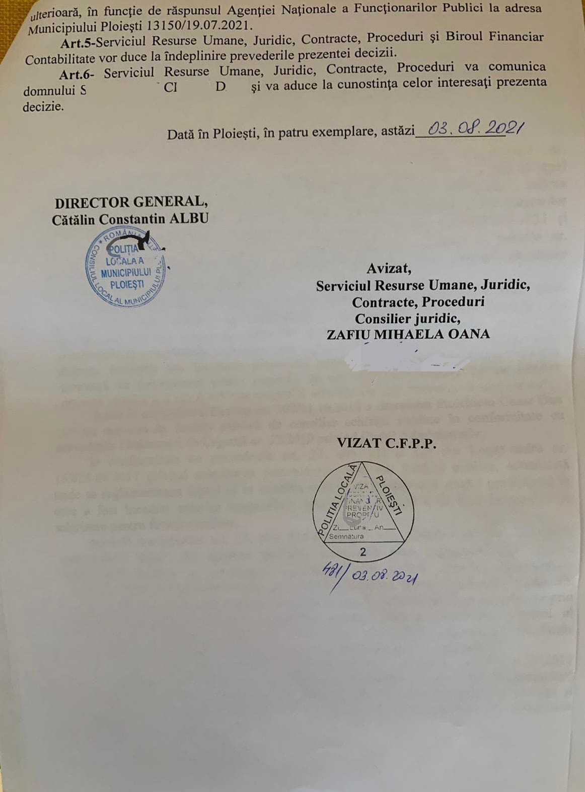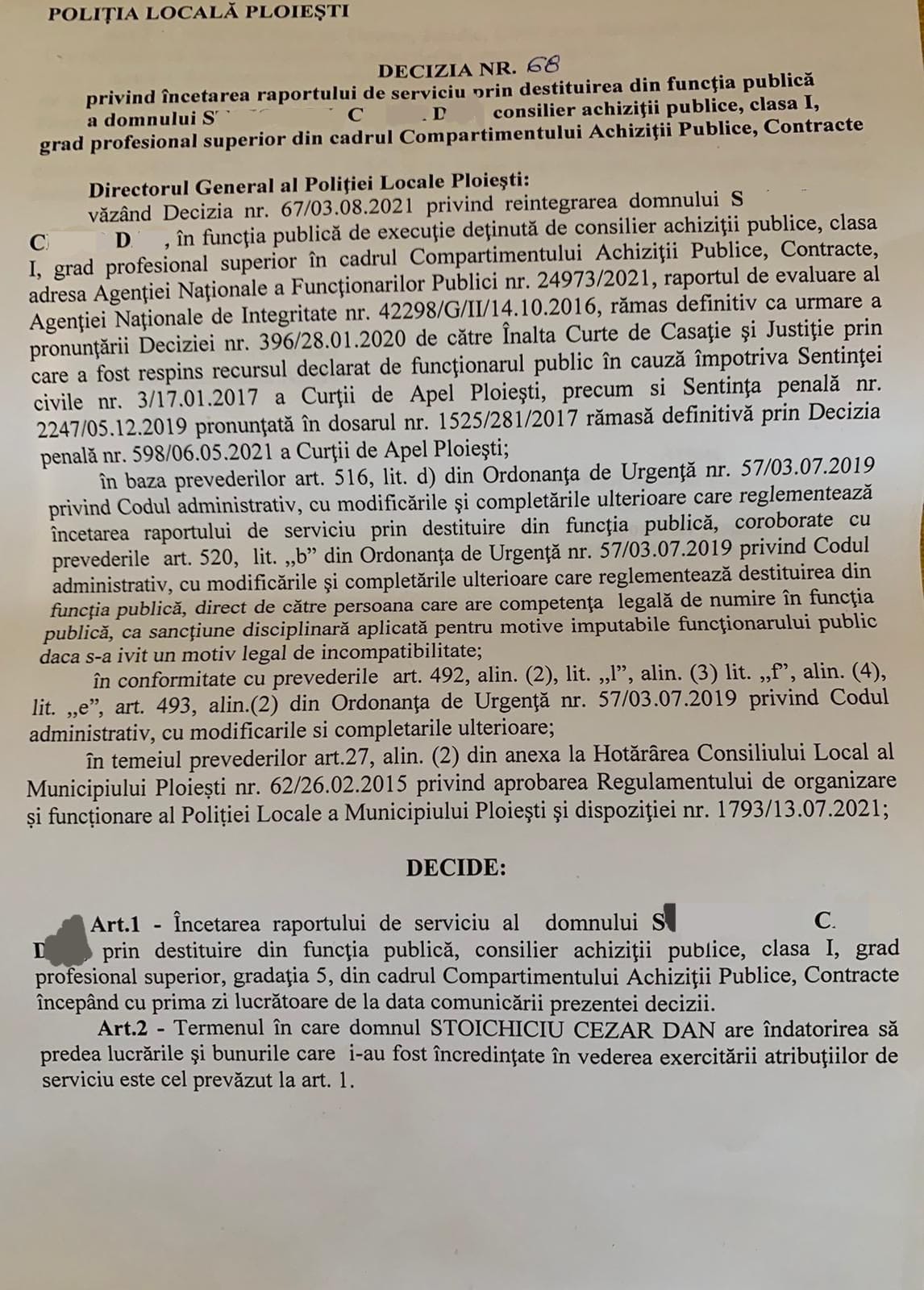 Pe scurt, Politia Locala Ploiesti dupa ce a emis decizia nr 67 prin care S.C.D este reangajat conform deciziei definitive ale instantei cu plata salariilor pe o perioada de peste 5 ani de zile, trebuia să il introduca în comisia de disciplină pe S.C.D in baza adreselor de la Agenția Națională de Integritate și Agenția Națională a Funcționarilor Publici .