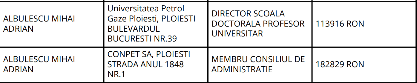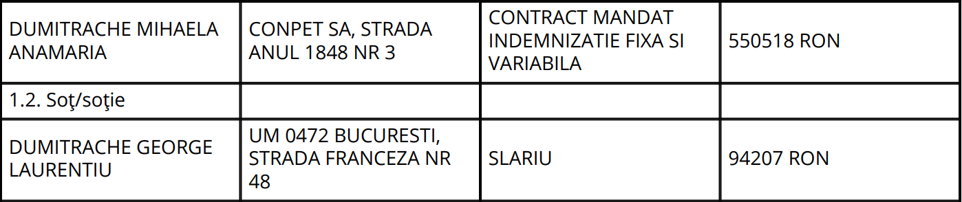 Două directoare Doamna Dumitrache Mihaela Anamaria, director general adjunct, a primit de la Conpet suma de 550. 518 lei în 2021. Net înseamnă peste 45.800 de lei lunar, peste 9.500 de euro. Soțul lucrează la SRI.