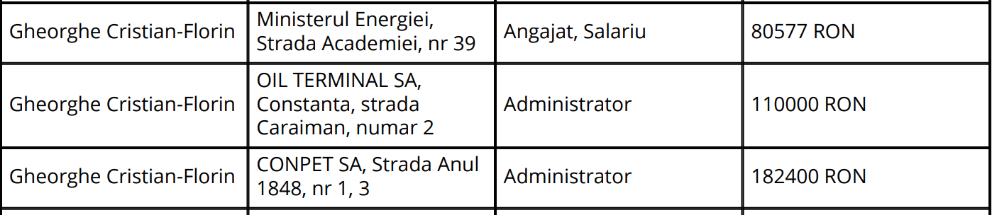 Cristian Florin Gheorghe Între 2013-2016 a fost consilier parlamentar al deputatului Remus Cernea, ales pe listele PSD. S-a ocupat cu deșeuri feroase și piese de mașini până în 2015, când brusc a ajuns într-o sinecură la stat. În 2017 a fost angajat la minister pe post de consilier și apoi, după numai un an, director general la țiței și gaze naturale, deși experiența lui profesională era zero în domeniu. Brut, a primit de la statul cel minunat anul trecut 637.568 de lei, adică 11.022 euro pe lună.