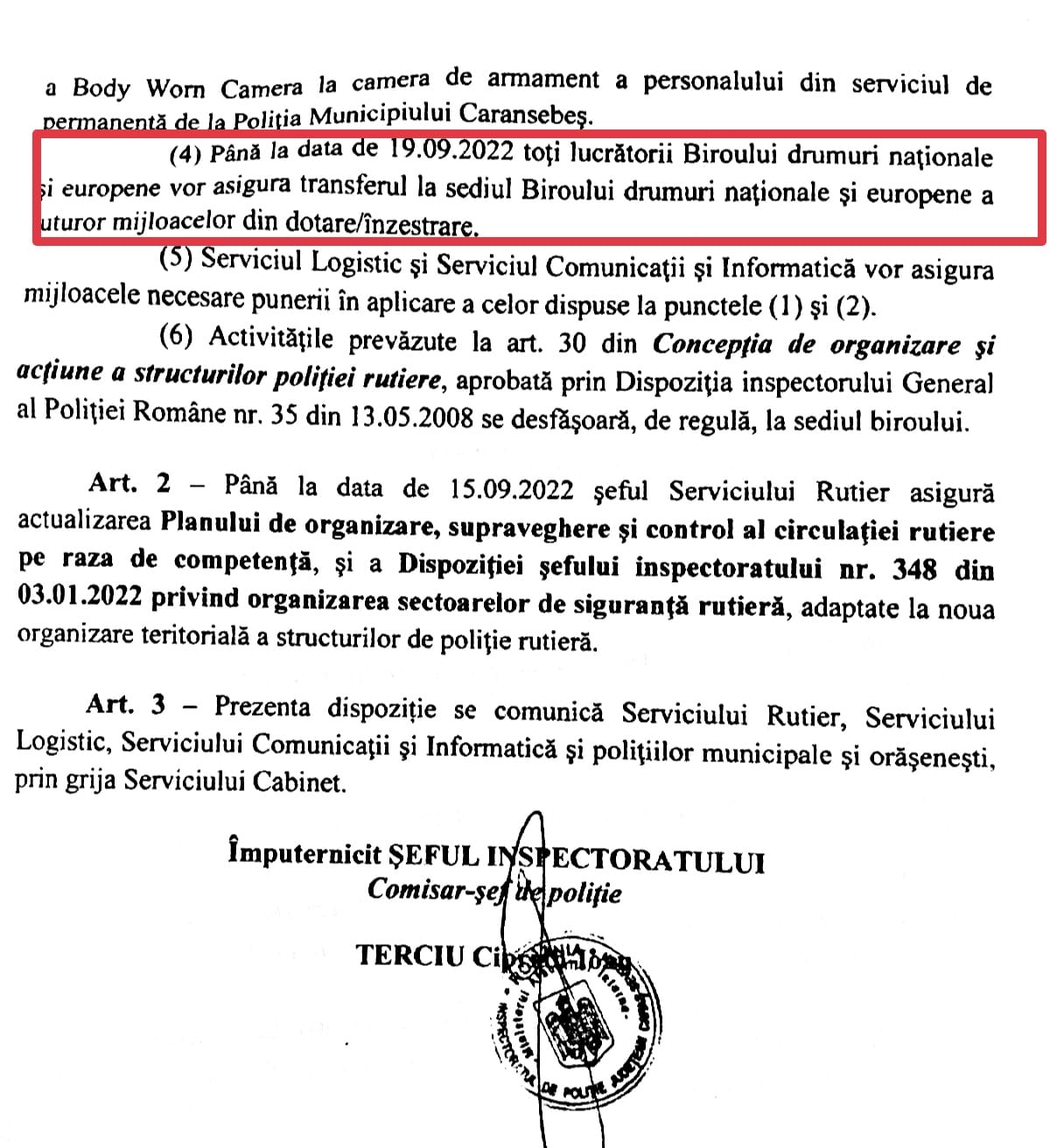 În ceea ce privește mutarea Biroului Drumuri Naționale și Europene sub aparenta necesitate a diminuării numărului de accidente rutiere grave, putem aduce la cunoștința opiniei publice faptul că această creștere este cauzată de modul defectuos în care polițiștii biroului au fost planificați să-și desfășoare activitatea, fiind ”plantați” să execute măsuri specifice cu preponderență în localități în care nu au fost înregistrate evenimente rutiere grave cu scopul de a-i ține departe de conducătorii auto cu influență în județ și de patronii firmelor ”preferențiale” astfel încât să nu-i mai sancționeze pentru încălcarea legislației în vigoare, mai dezvaluie sursa citata.