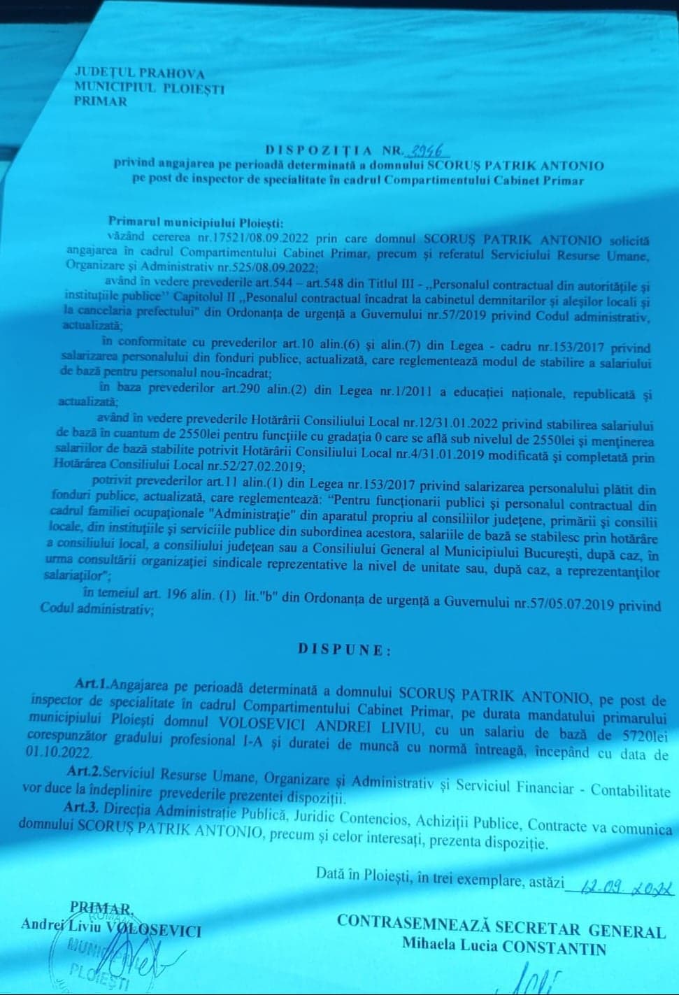 Pe modelul Valeriu Răchită, consilierul personal al edilului, Patrik Scoruş, noul consilier/expert in cabinetul primarului de la data de 01.10.2022, ocupa, in prezent, una dintre cele 3 functii de metodist la CSM Ploiesti, o functie care NU se regaseste in reglementarile legale aprobate prin HCL!