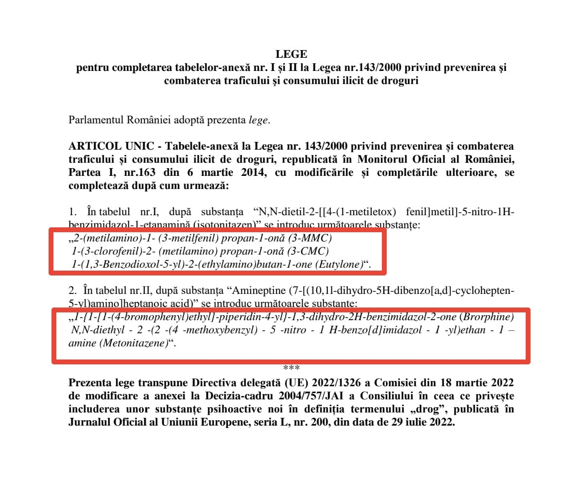 Astfel, conform Directivei delegate (UE) 2022/1326 a Comisiei de modificare a anexei la Decizia-cadru 2004/757/JAI a Consiliului în ceea ce privește includerea noilor substanțe psihoactive, respectiv: 2-(metilamino)-1- (3-metilfenil) propan-1-onă (3-MMC) și 1-(3-clorofenil)-2- (metilamino) propan-1-onă (3-CMC) în definiția termenului „drog”, precum și al implementării Convenției unice asupra stupefiantelor din 1961 și Convenției asupra substanțelor psihotrope din 1971, în sensul includerii substanțelor care nu sunt puse, încă, sub control național, al cărei termen de implementare pentru România este data de 18 februarie 2023, pe site-ul MAI a fost pus în Transparență decizională Proiectul legii pentru completarea tabelelor-anexă nr. I și II la Legea nr.143/2000 privind prevenirea şi combaterea traficului şi consumului ilicit de droguri.