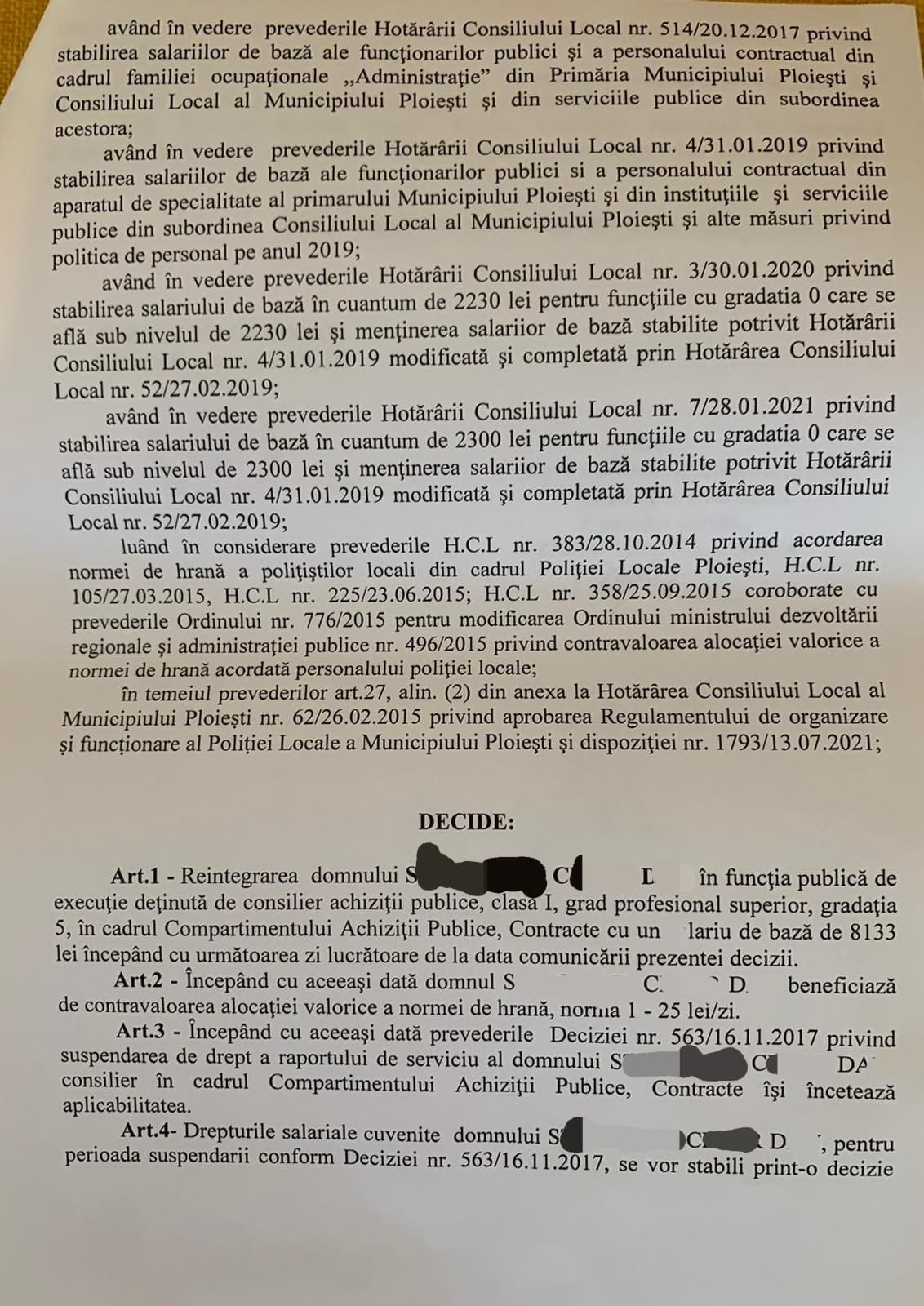 Mai mult, acesta s-a adresat si instantei, in civil, unde – prin Hotarârea 2831/2021 a Tribunalului Prahova care a fost emisa in data de 16.11.2021, o hotarare prin care reclamantul a castigat din nou despăgubiri egale cu salariile indexate, majorate si reactualizate si cu celelalte drepturi de care ar fi beneficiat pe întreagă perioadă de suspendare a contractului individual de muncă si reancadrarea pe postul de functionar public detinut anterior la achizitii din cadrul Politiei Locale Ploiesti.