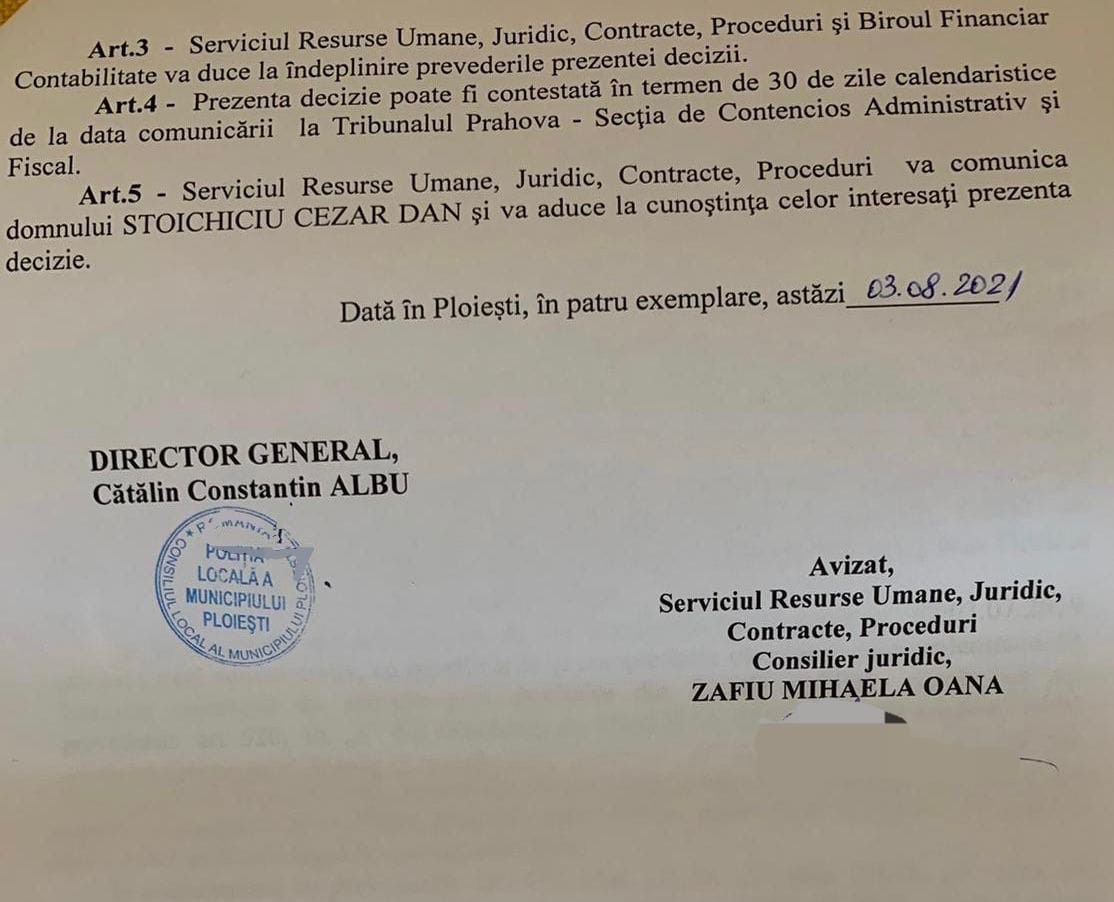 Pentru a demonstra ca acest prejudiciu adus bugetului local NU este de ajuns (aceste sume fiind platite din taxele ploiestenilor), onor Albu Catalin, in bataie de joc fata de lege si de banii ploiestenilor, emite in acelasi minut din data de 03.08.2021, o noua decizie (nr 68) printr-o interpretare propie a legii si il destituie, ilegal, pe acelasi S.C.D pe care instanta il obligase sa il reaincadreze.
