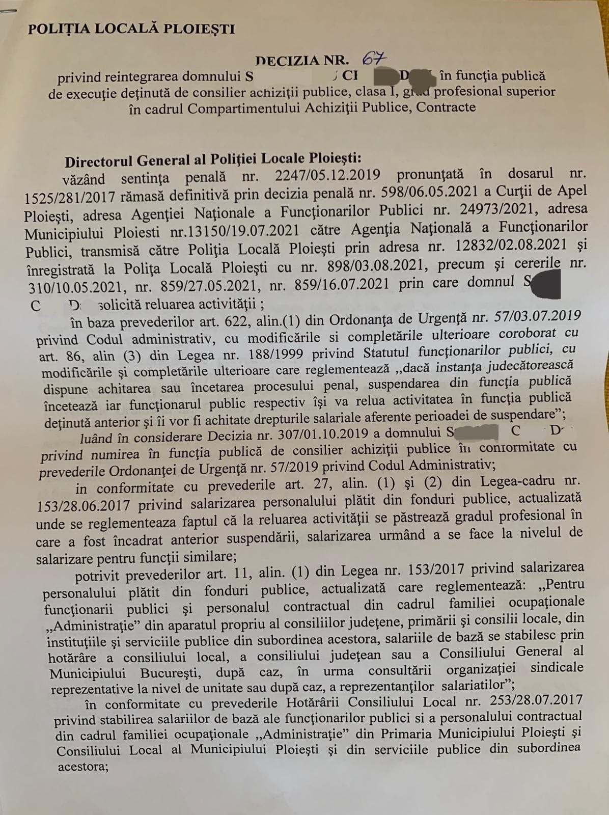 Reamintim ca, fostul sef Achizitii al Politiei Locale Ploiesti a castigat in instanta procesul care a durat ani de zile  pana cand s-a decis ca acesta trebuie sa fie repus in drepturi.