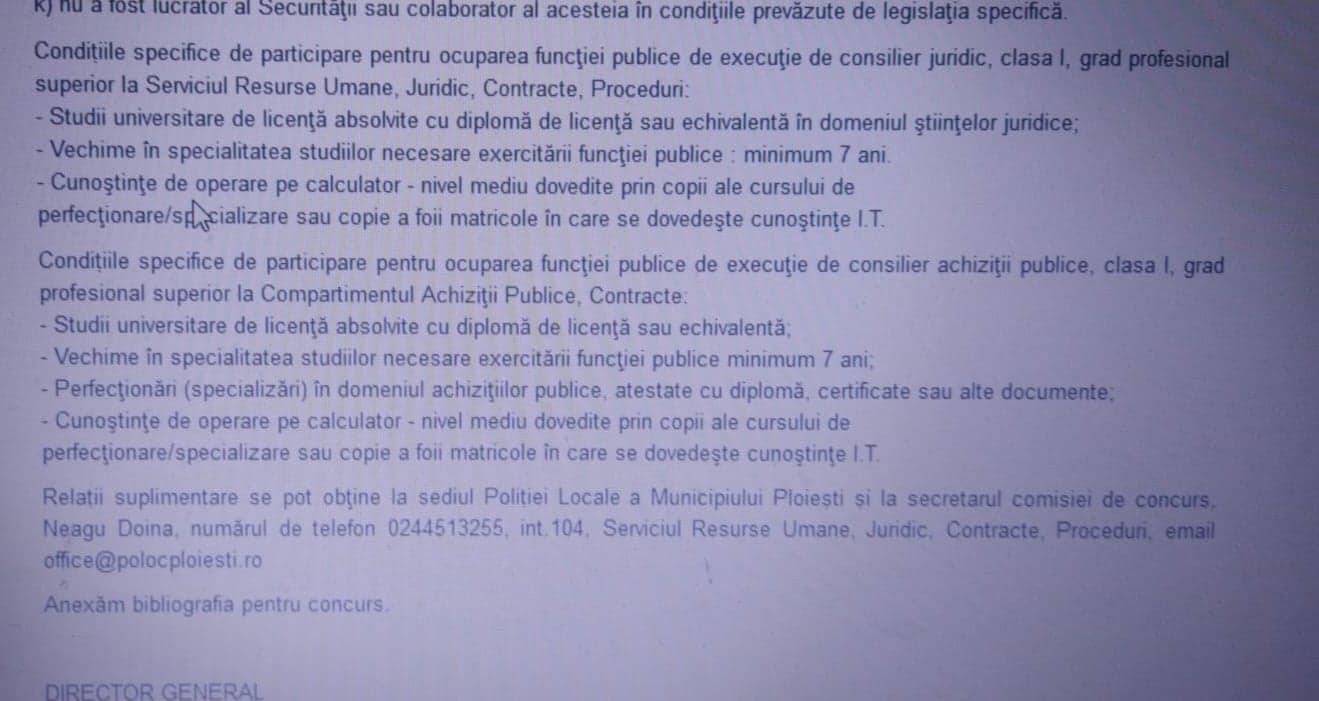Se cerceteaza modul de organizare a concursurilor din administratia locala si de la Politia Locala Ploiesti unde posturile au fost scoase la concurs cu „dedicatie”, stabilindu-se la cerintele pentru inscriere, in afara legii, criterii care le indeplineau doar cei pentru care posturile au fost create.