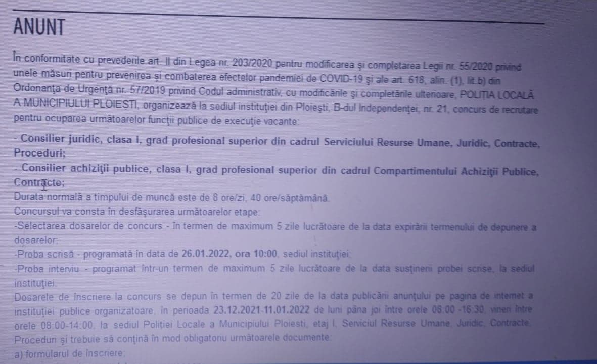 Deci, cu scoaterea la concurs al postului de la achizitii au fost scoase si alte doua posturi la Oficiul Juridic, tot la aceeasi data.