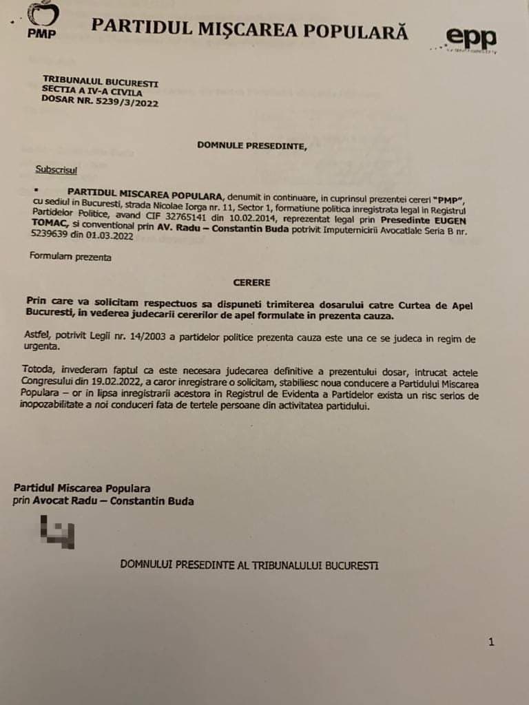 „Dovada clară, prezentată de propriul avocat, că Eugen Tomac NU ESTE PREȘEDINTELE PMP, noua conducere și „noul început” fiind doar o cacialma” Vom reveni. (Cerasela N.).