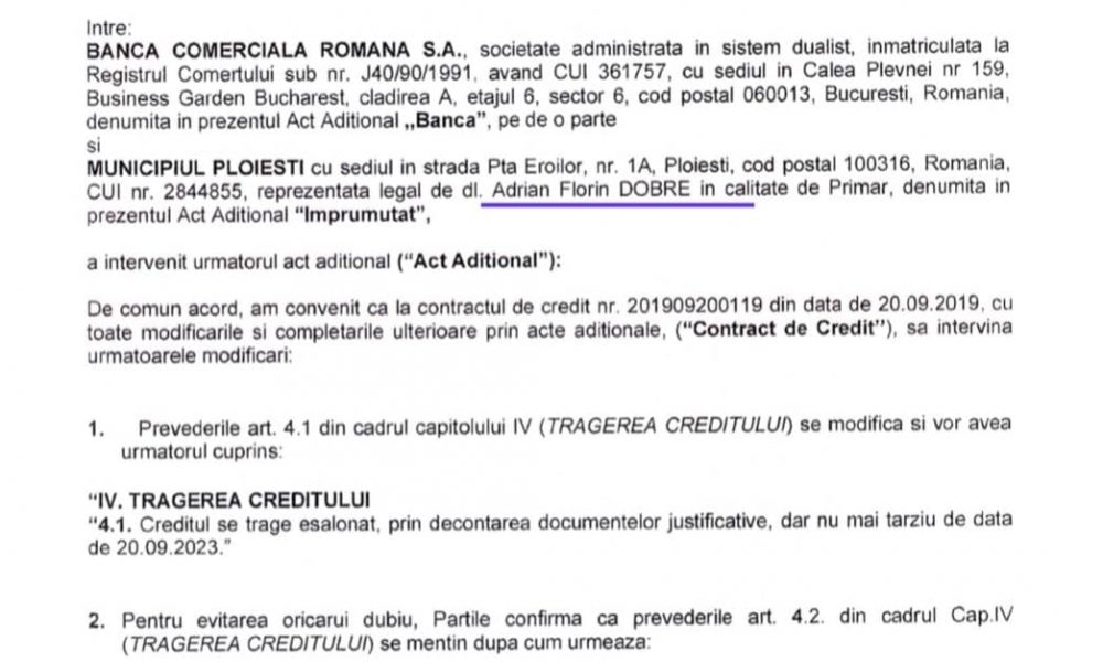 Primarul Andrei Volosevici semneaza, de capul sau, fara o Hotarare a Consiliului Local Ploiesti, un act aditional cu BCR, la data de 20.09.2022, pentru prelungirea perioadei de tragere pana la data de 20.09.2023.