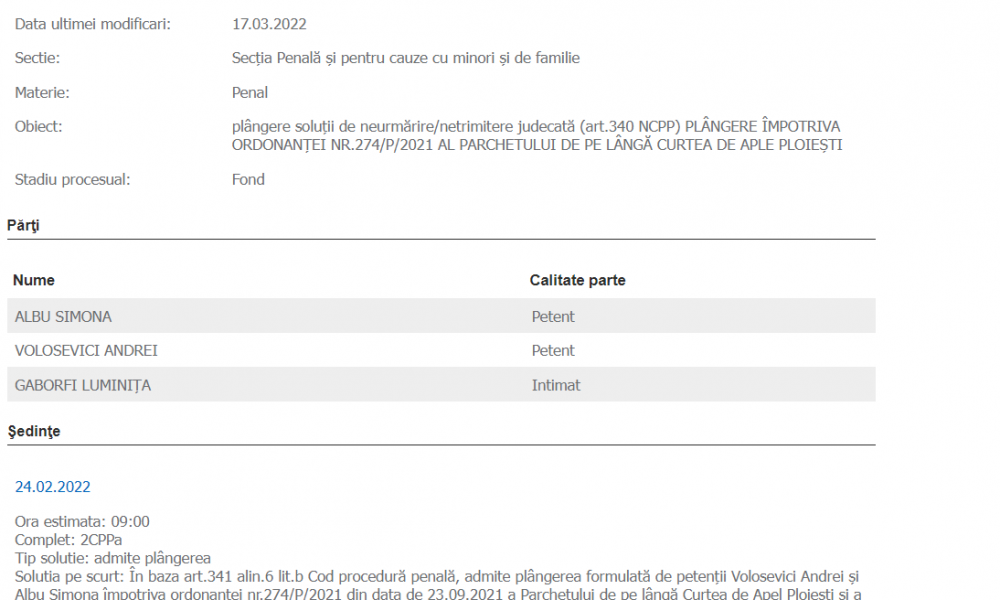Pe rolul DNA Strctura Centrala a fost deschis un dosar penal pentru abuz in serviciu, pe numele primarului Andrei Volosevici, Albu Simona (nasa edilului si city manager al municipiului Ploiesti) si Ioana Otilia Pelin (sef Serviciu Buget, Imprumuturi). Dosarul penal are numarul de inregistrare P/33/776 – deschis la data de 18.11.2022.