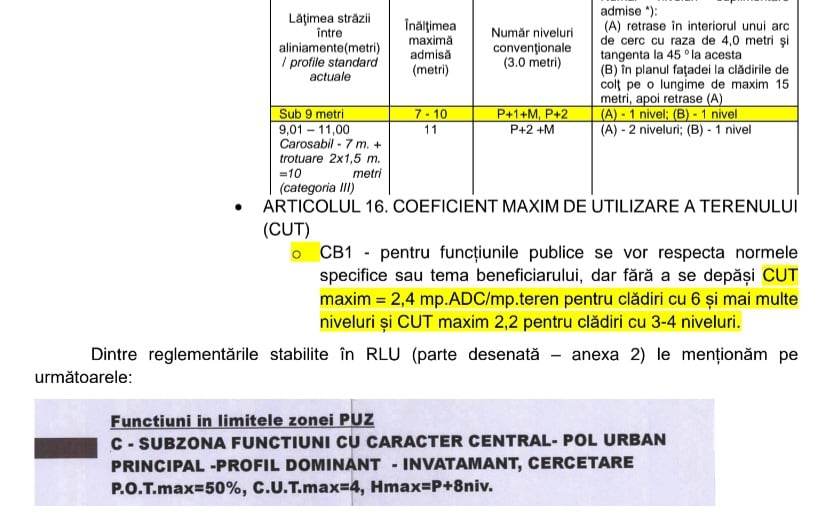 NECONCORDANȚE LA NIVEL DE PUZ (între partea desenată și cea scrisă) Valoarea coeficientului CUT: – în partea scrisă: CUT maxim = 2,4 mp.ADC/mp.teren pentru clădiri cu 6 și mai multe niveluri și CUT maxim 2,2 pentru clădiri cu 3-4 niveluri. – în partea desenată: CUT maxim = 4