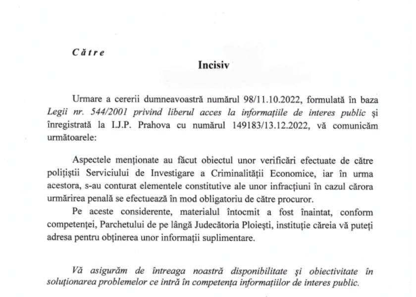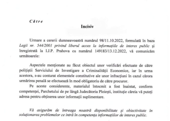 La data de 18.11.2022, organele de cercetare penala din cadrul IPJ Prahova, prin adresa nr 239025/18.11.2022, au confirmat dezvaluirile ziarului Incisiv de Prahova cu privire la “Bomba ecologica de la Pleasa”, precizand in clar: reprezentantii Recop Recycling SRL Pleasa NU au respectat prevederile legale!
