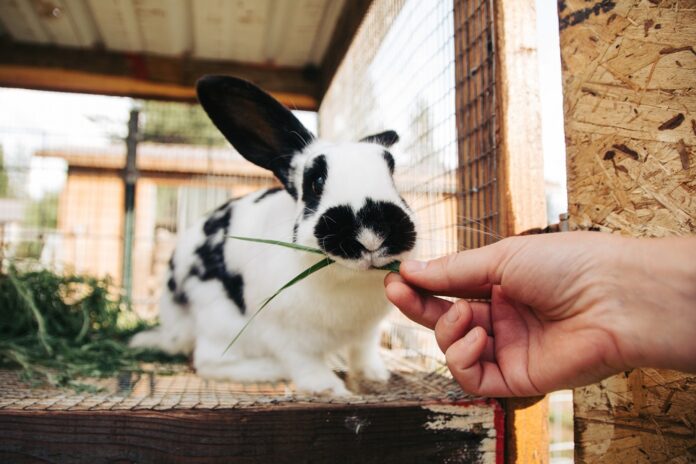 Adult female rabbit eating a sprig of grass in a homemade rabbit hutch.