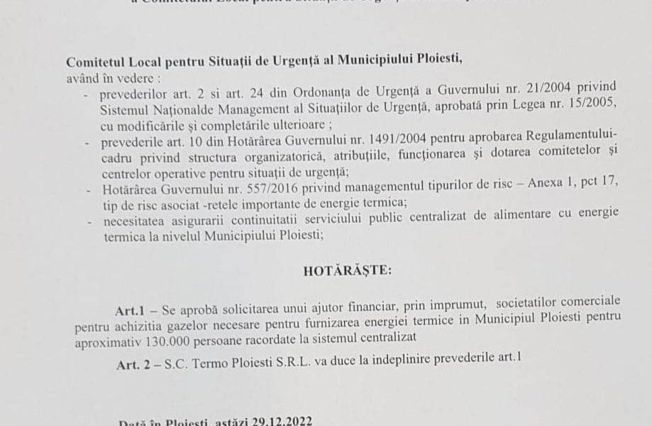 Cu o hotarare bizara a Comitetului Local pentru situatii de Urgenta al Municipiului Ploiesti, cu o hotarare AGA si o hotarare a CA de la Termo Ploiești si fara aprobarea C.L. Ploiesti s-a ajuns ca operatorul de termoficare să se împrumute, in mod ilegal, de la o societate comercială non-bancară. Despre legile incalcate si incadrarea juridica a faptelor vom reveni intr-un articol separat. Avizul Prefecturii Prahova a fost emis in mod legal, in rest… doar o “sarabanda” a ilegalitatilor.