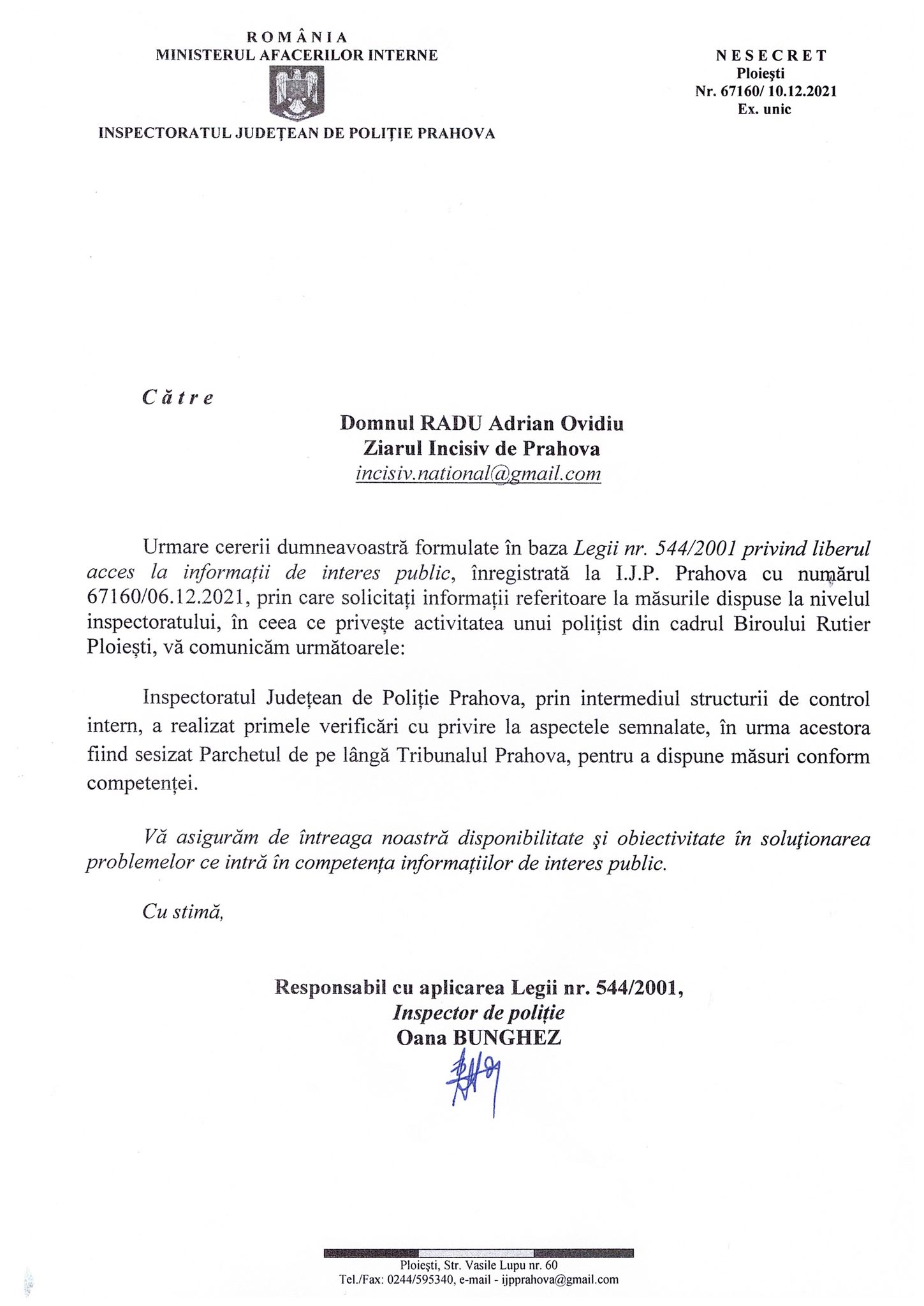 Umilirea si musamalizarea ordinara se poate vedea din avion, jurnalistul nostru realizand ca totul a fost o facatura ordinara in momentul in care, iesit cu scarba din aceasta institutie, a citit procesul-verbal seria PPHX 637070, prin care marele nostru si brav agent ca „organ” de nadejde ce face cinste IPJ-ului Prahova a specificat ca personajul care l-a accidentat pe reprezentantul nostru nu numai ca nu a ramas cu permisul suspendat, ci a primit doar AVERTISMENT si 3 puncte de penalizare. Deci, dragi interlopi, luati niste „janghine” de masini si treceti la accidentat incomozii! IPJ Prahova va protejeaza!