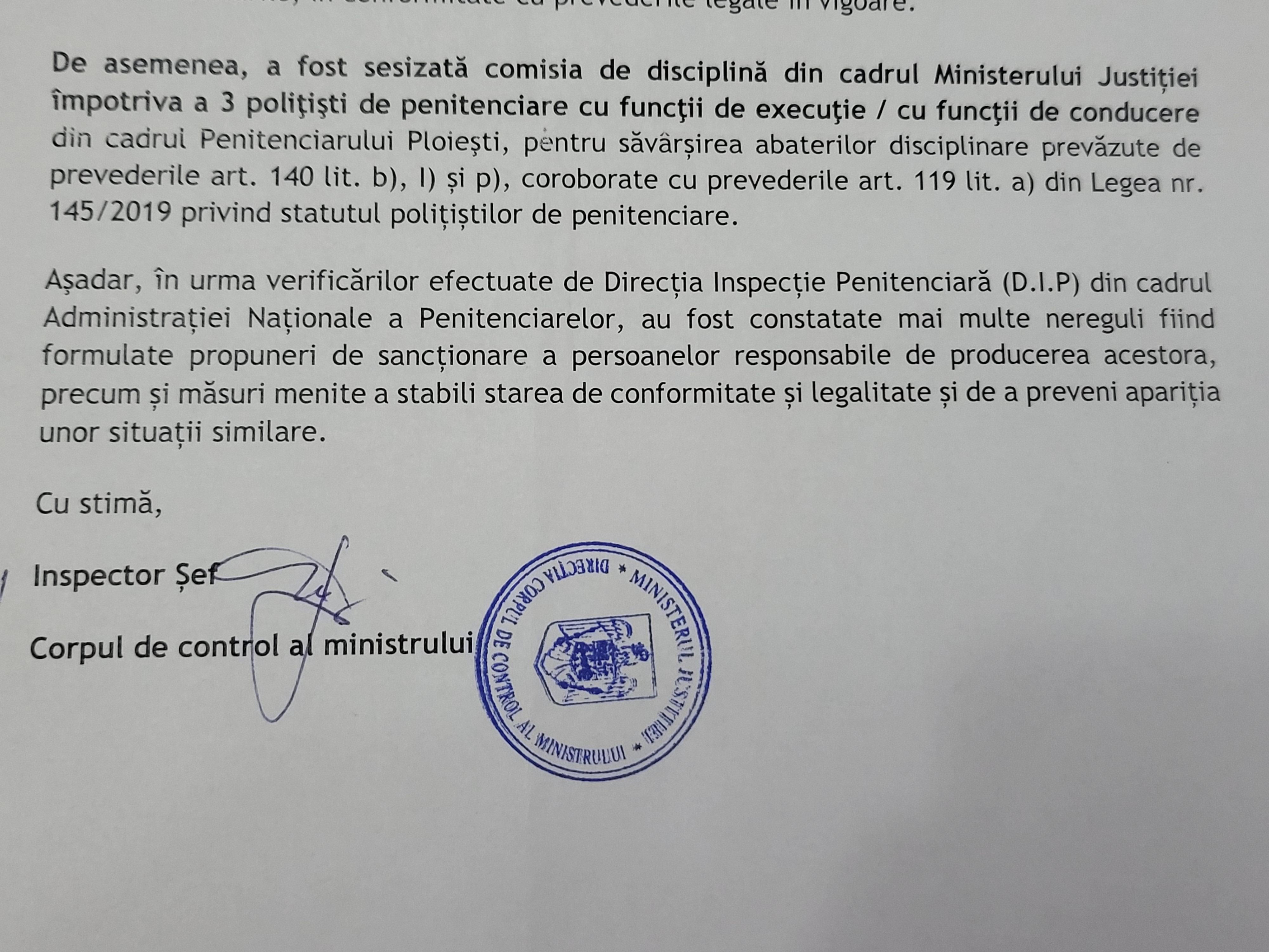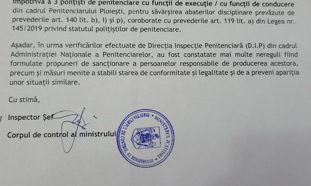 Prin adresa nr H/101136/782/P/2020/29.01.2021, Corpul de Control al Ministrului Justitiei. sub semnatura, recunoaste ca a fost sesizata comisia de disciplina din cadrul MJ impotriva a 3 politisti de penitenciare cu functii de executie/cu functii de conducere din cadrul Penitenciarului Ploiesti pentru abateri disciplinare care in opinia noastra si a judectorului de camera preliminara sunt infractiuni. Printre cei vizati de comisia de disciplina era si simpaticul nostru imputernicit la comanda unitatii, Comisarul șef de poliție penitenciară Valentin MATEI.