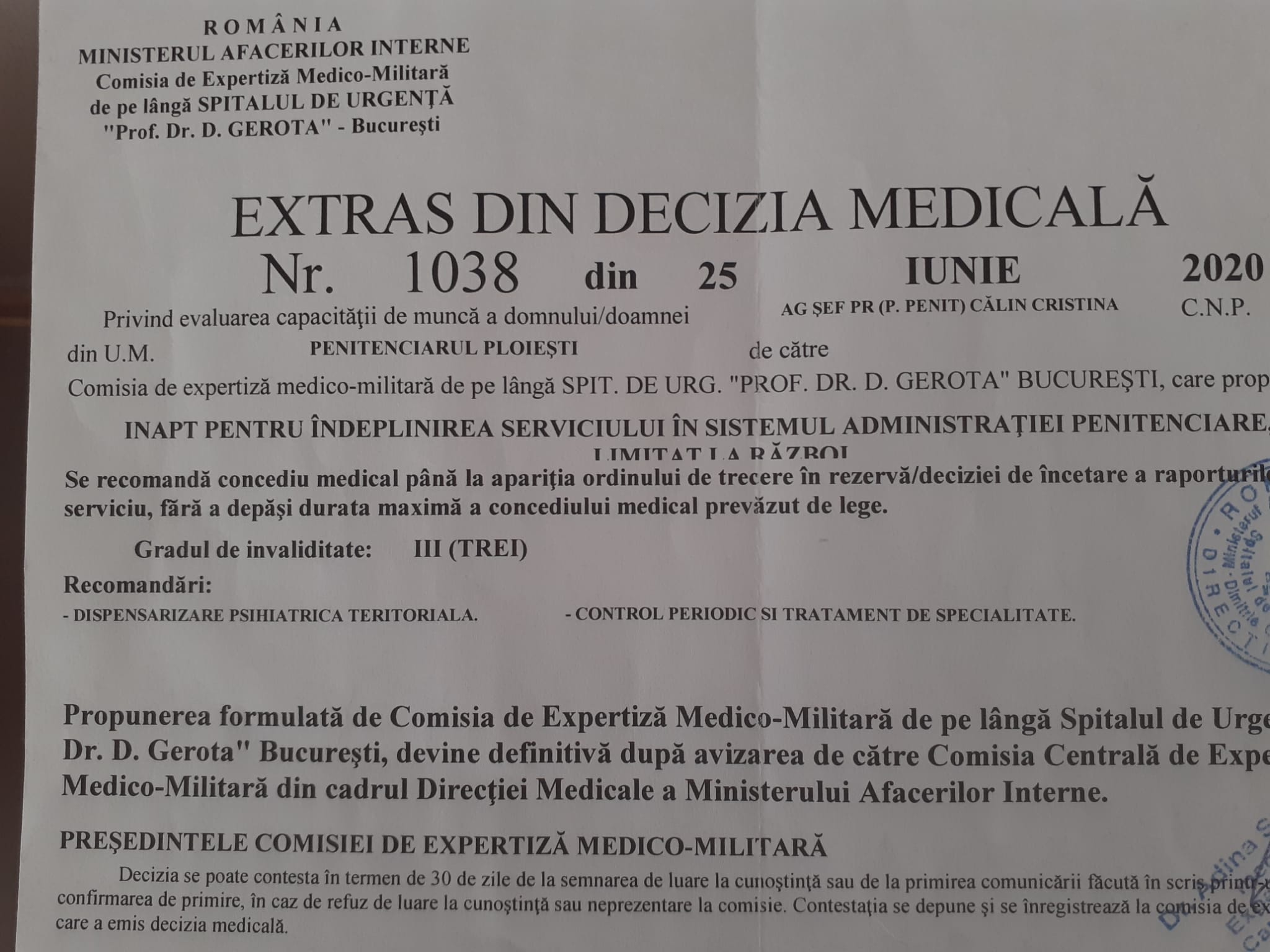 Vă interesează că rezultatul comportamentului mafiot și amenițările i-au afectat starea de sănatate? Că ați băgat-o în Spital? Că practic i-ați distrus viața! I s-a agravat în asemenea hal sănătatea , încât Membrii Comisiei de Expertiză Medico-Militară de la Gerota au declarat-o ,,Inapt cu Grad de Invaliditate III ”?