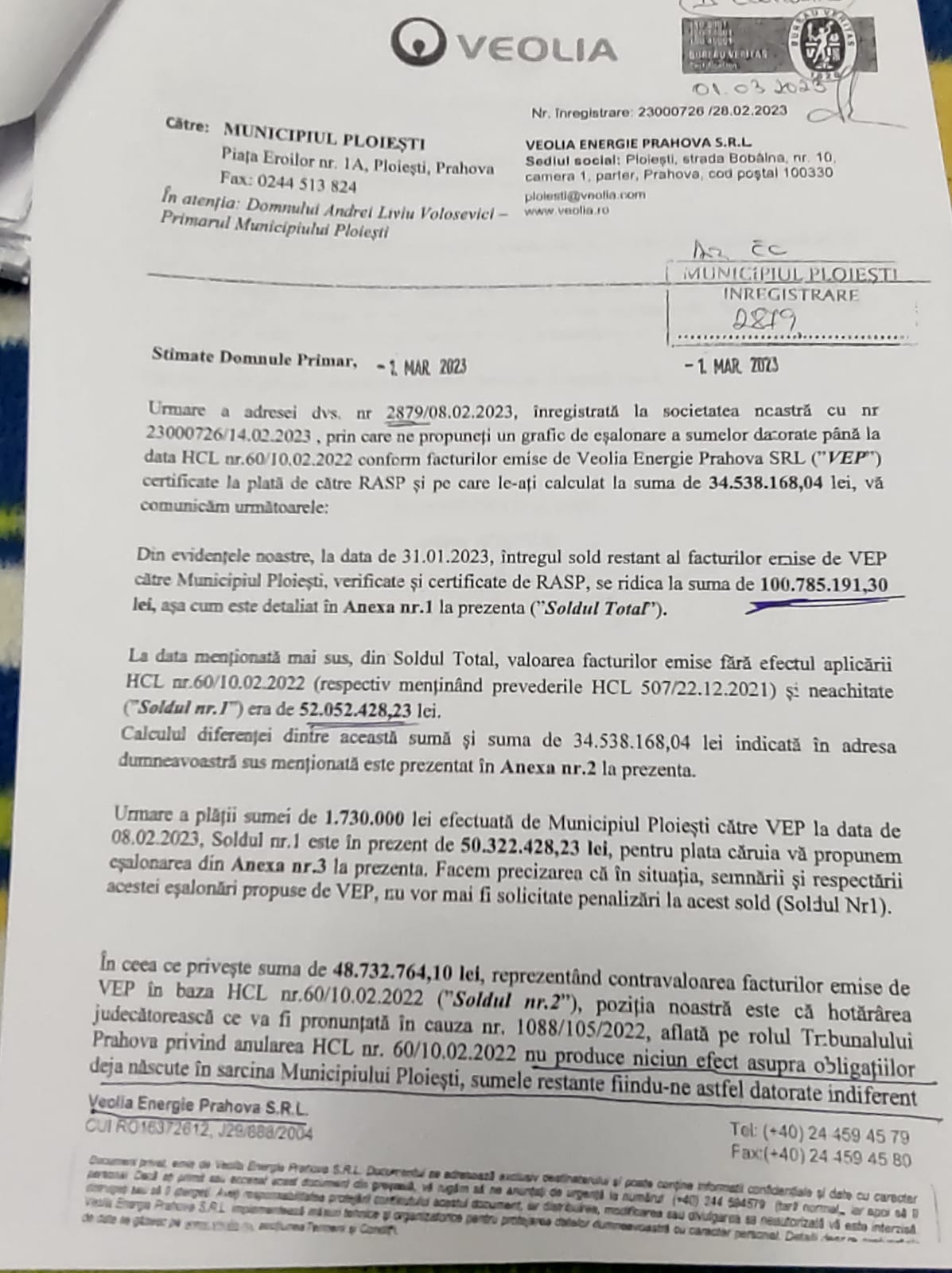 Luați și citiți domnule primar, daca aveți chef, ia uite ce va spune Veolia, că aveți datorii de 100. 785. 191,30 lri