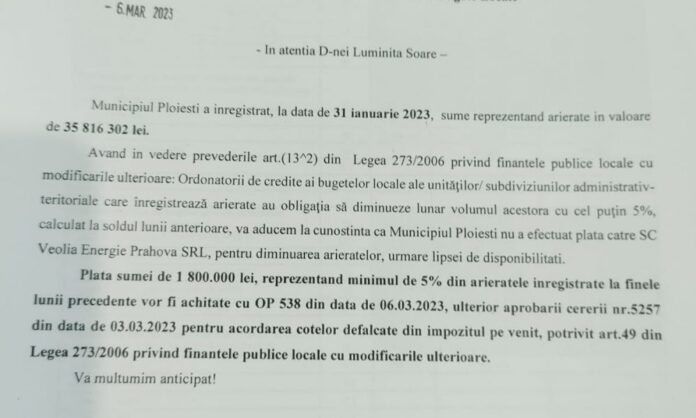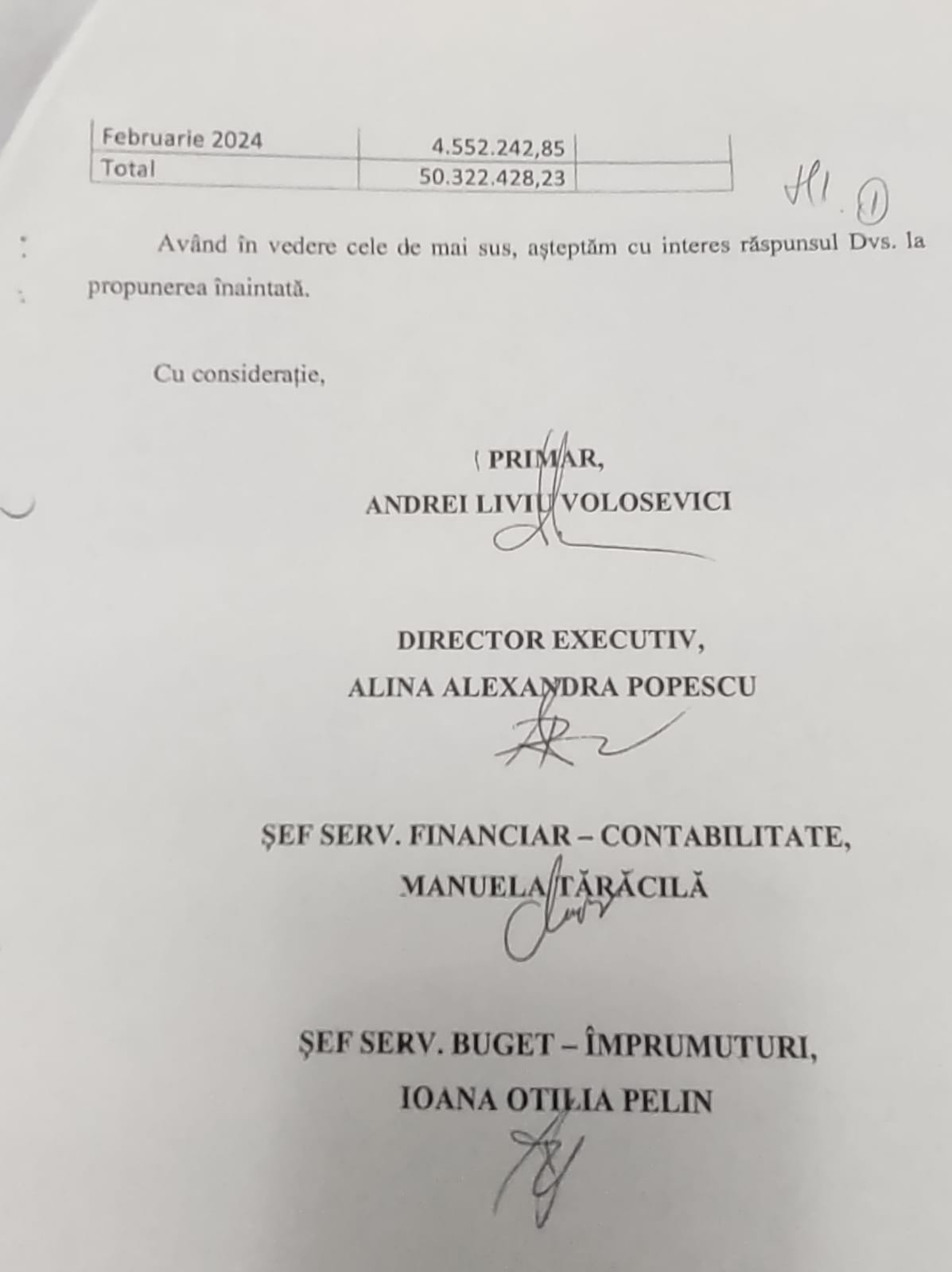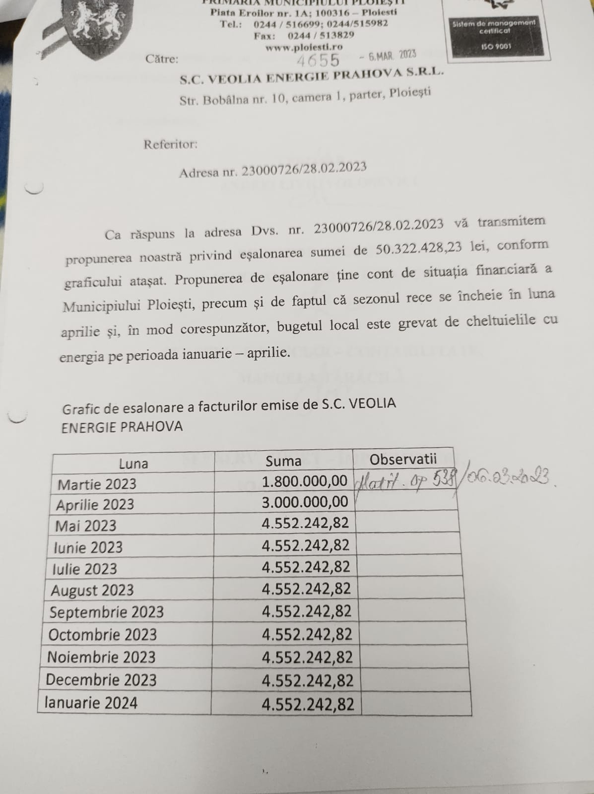 In aceeași zi transmite la Veolia adresa 4655 și solicită eșalonarea sumei de 50 322 428, 23 lei, semneaza aceeași Albu Simona pentru primar!
