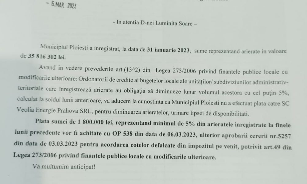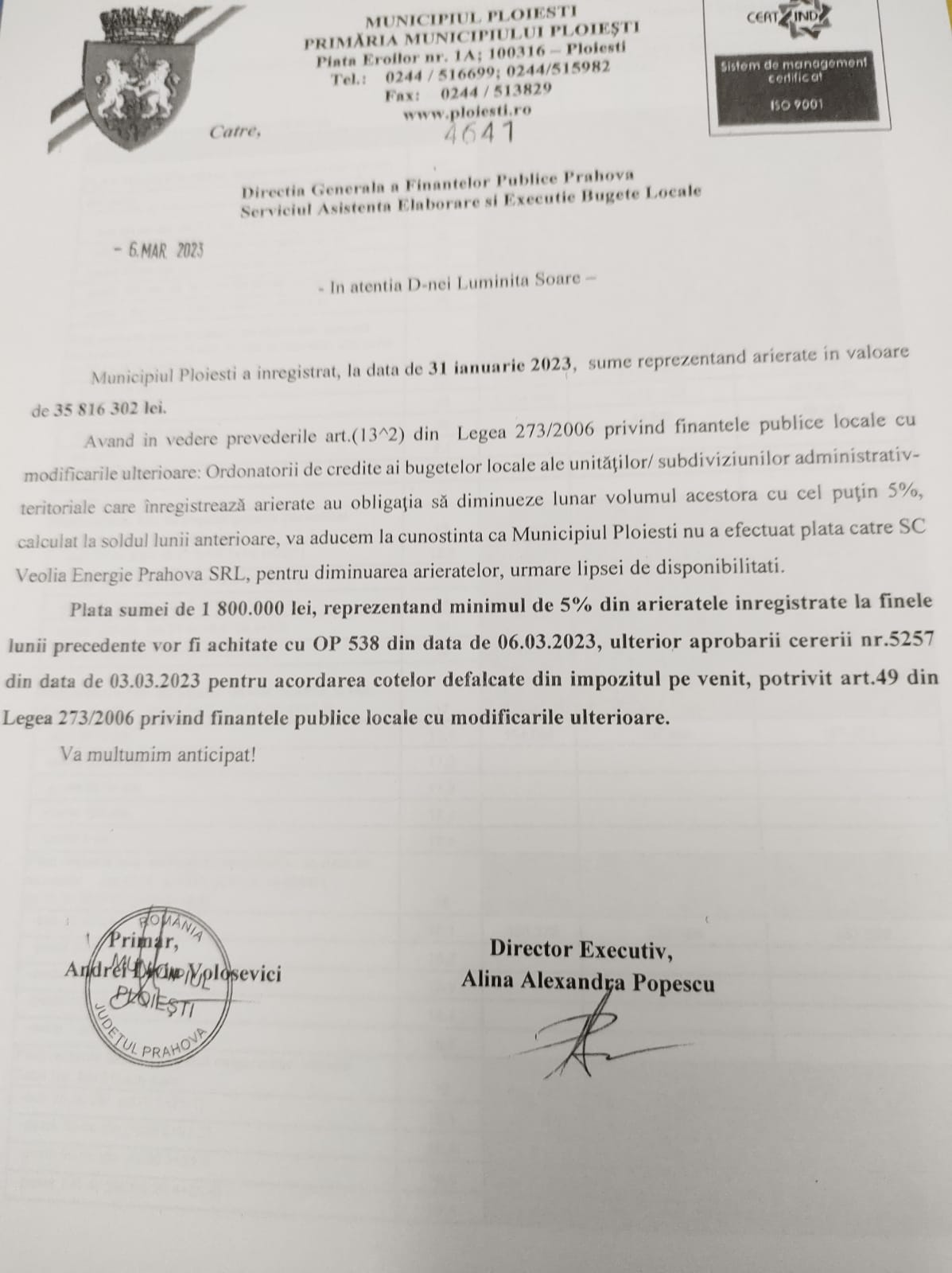Și va spune Veolia și Prefectura cum stau lucrurile! Citat: „NU produce niciun efect asupra obligatiilor deja născute în sarcina Municipiului Ploiesti”…așa va spune? Ați citit? Sau erați pe teren cu lucrările pe fonduri UE, PNRR, că de aceea luați majorarea salarială pe fonduri din prima zi de mandat. Pe fondurile alea pierdute si atrase de Dobre!