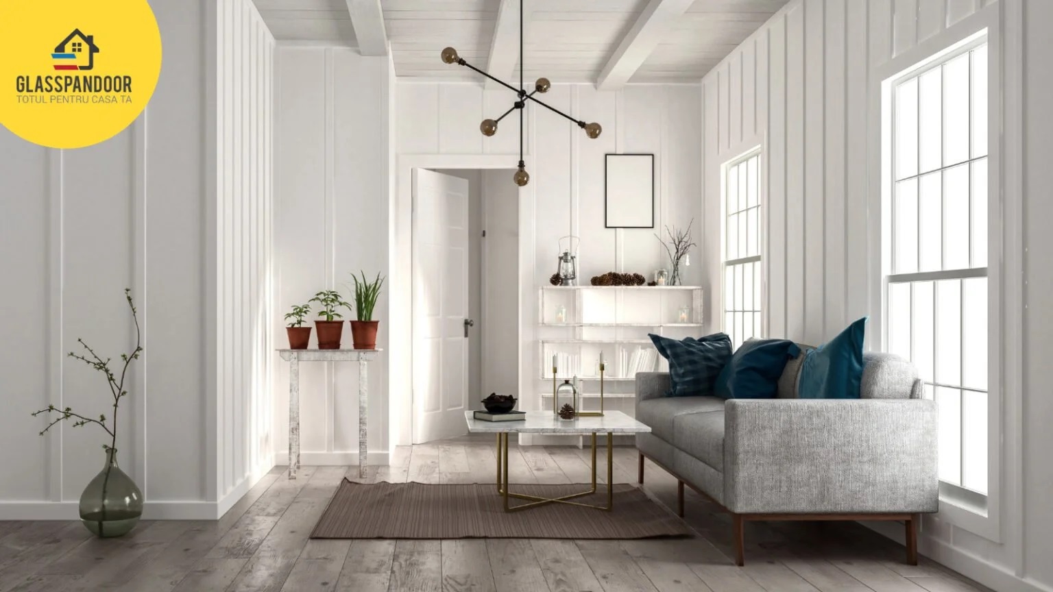 O ușă de interior cu un geam simplu sau un panou de sticlă mată poate fi o alegere excelentă pentru a permite luminii să pătrundă în încăpere și pentru a crea o atmosferă deschisă.