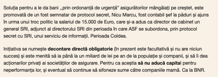 E suficient să citiți titlurile (dacă nu aveți câteva ore pentru a citi întreaga investigație, pe care am făcut-o în sute de ore de analiză, de muncă de documentare și investigație, din 2021 până în 2023, pe baza înțelegerii exacte a cum funcționează atât piața asigurărilor cât și, mai bine decât oricine din presă, mecanismul de luare a deciziilor în ASF sau de neluare a deciziilor din ASF (am fost purtător de cuvânt al ASF, pentru o scurtă perioadă, până în Decembrie 2014):