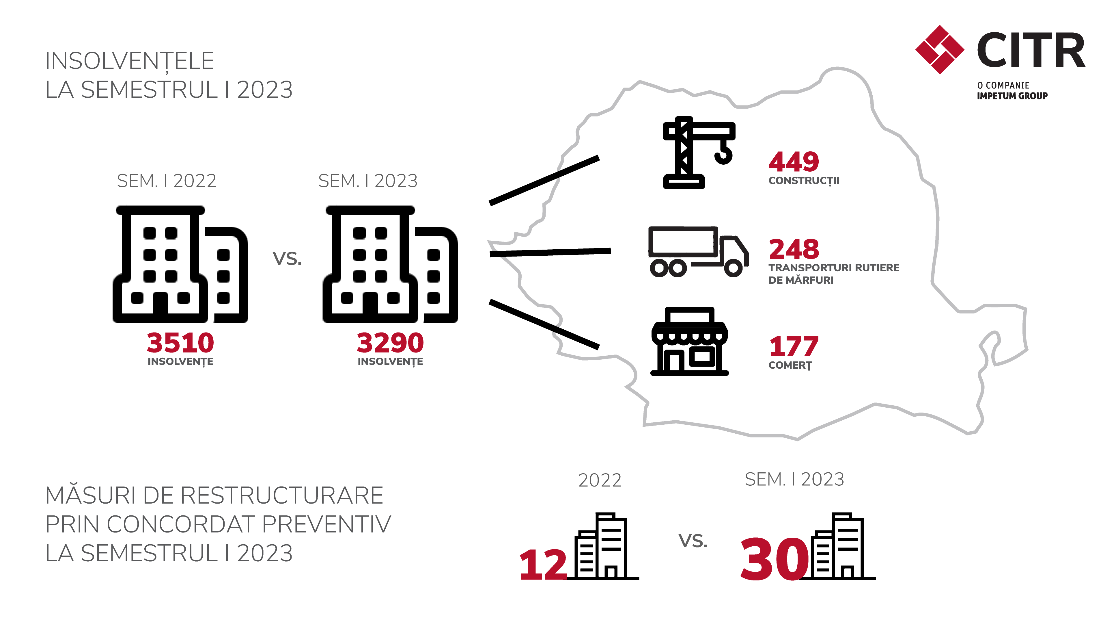 București, 31 iulie 2023 – CITR, liderul pieței de insolvență și restructurare din România, analizează evoluția restructurărilor și insolvențelor din primul semestru al anului 2023, iar rezultatele arată un interes crescut al mediului de business pentru noile produse de restructurare, cu 30 proiecte de concordat preventiv, dintre care două sunt deja omologate de către instanță. Numărul companiilor intrate în insolvență scade cu 6,2%, la 3.290, față de 3.510 în aceeași perioadă a anului trecut. În același timp, în rândul companiilor de impact, numărul celor intrate în insolvență crește ușor: 35, față de cele 32 din primele șase luni ale anului 2022.